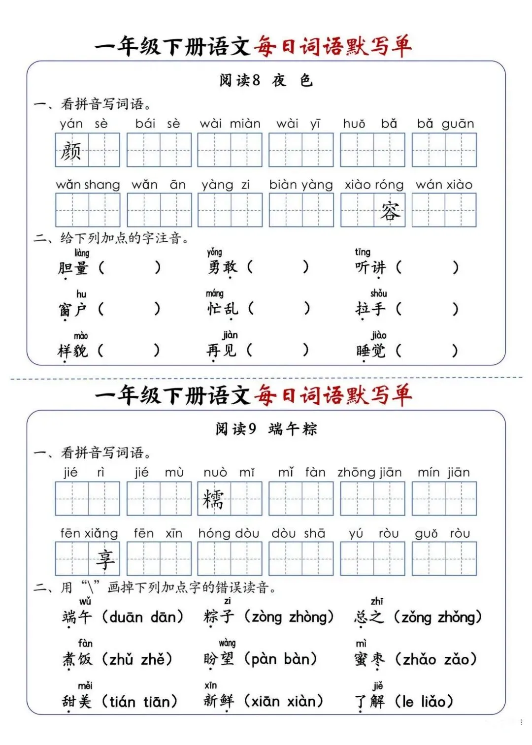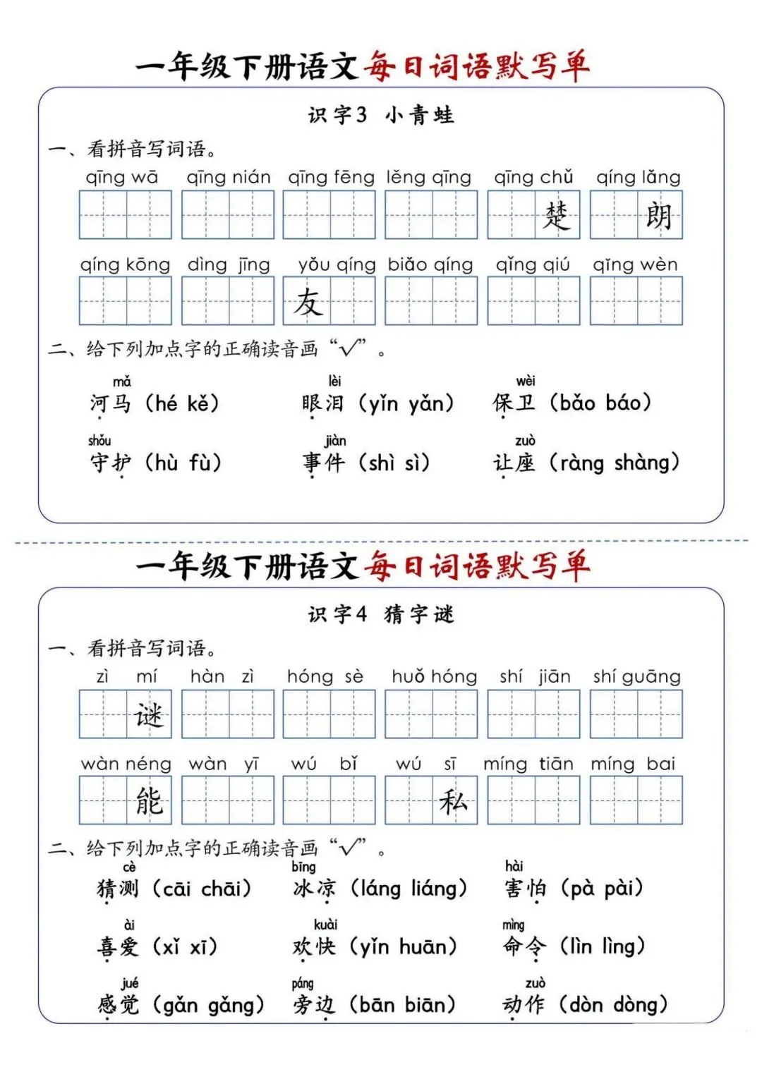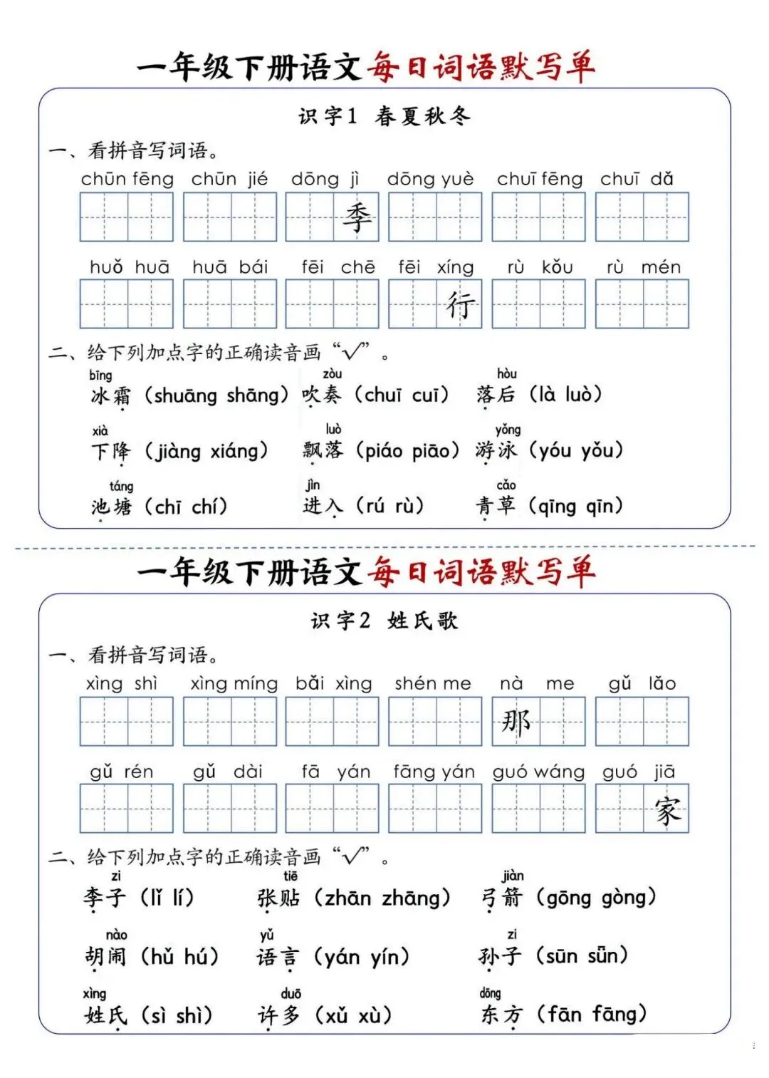 新版一年级下册语文每日词语默写单高清电子版可打印