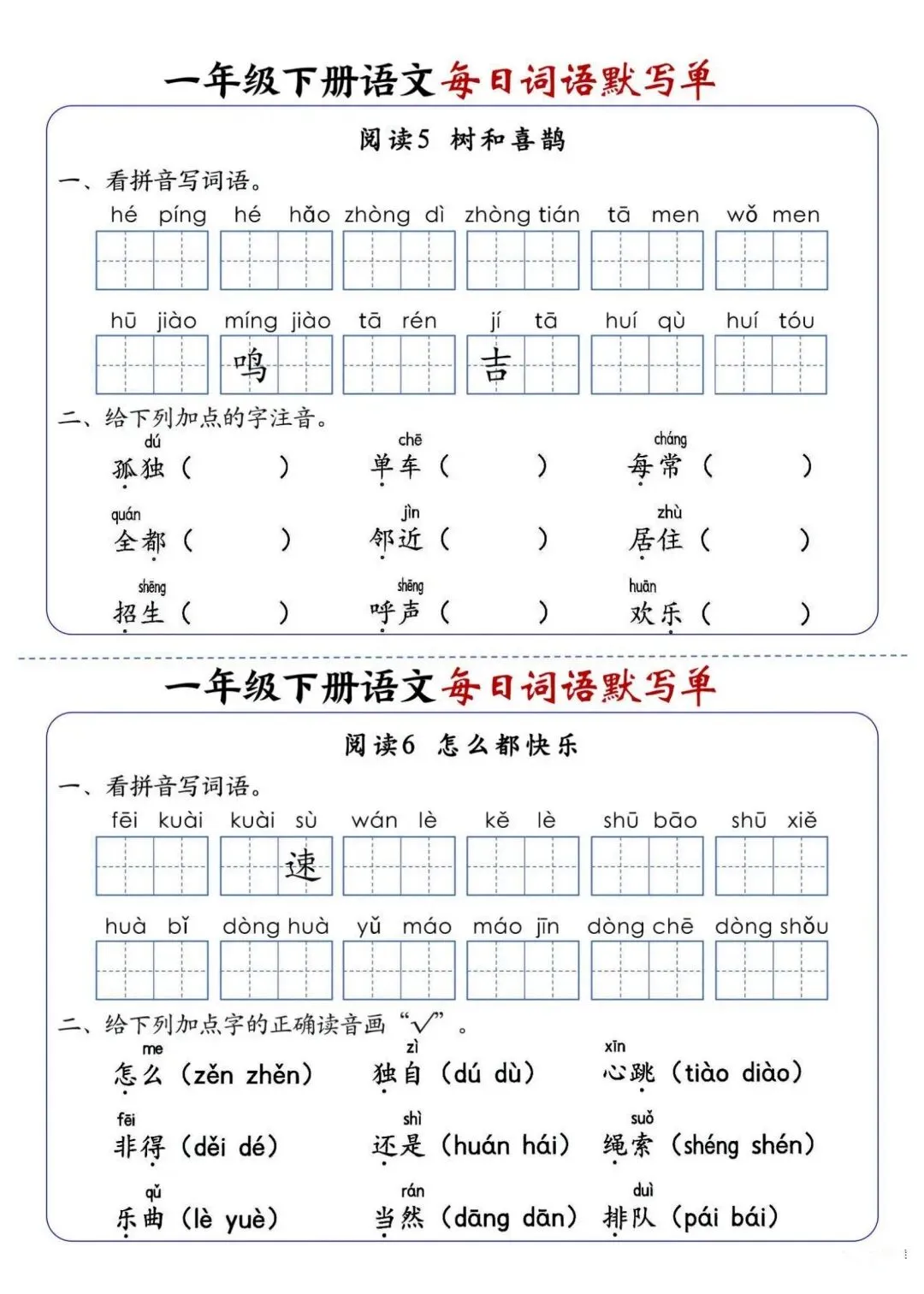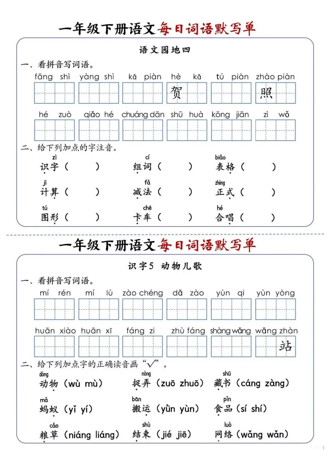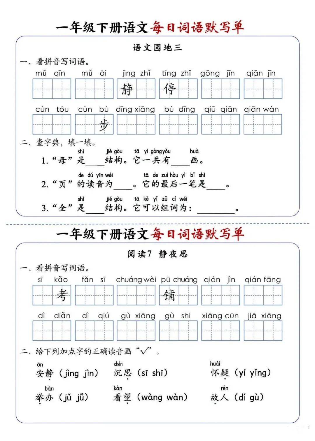 新版一年级下册语文每日词语默写单高清电子版可打印