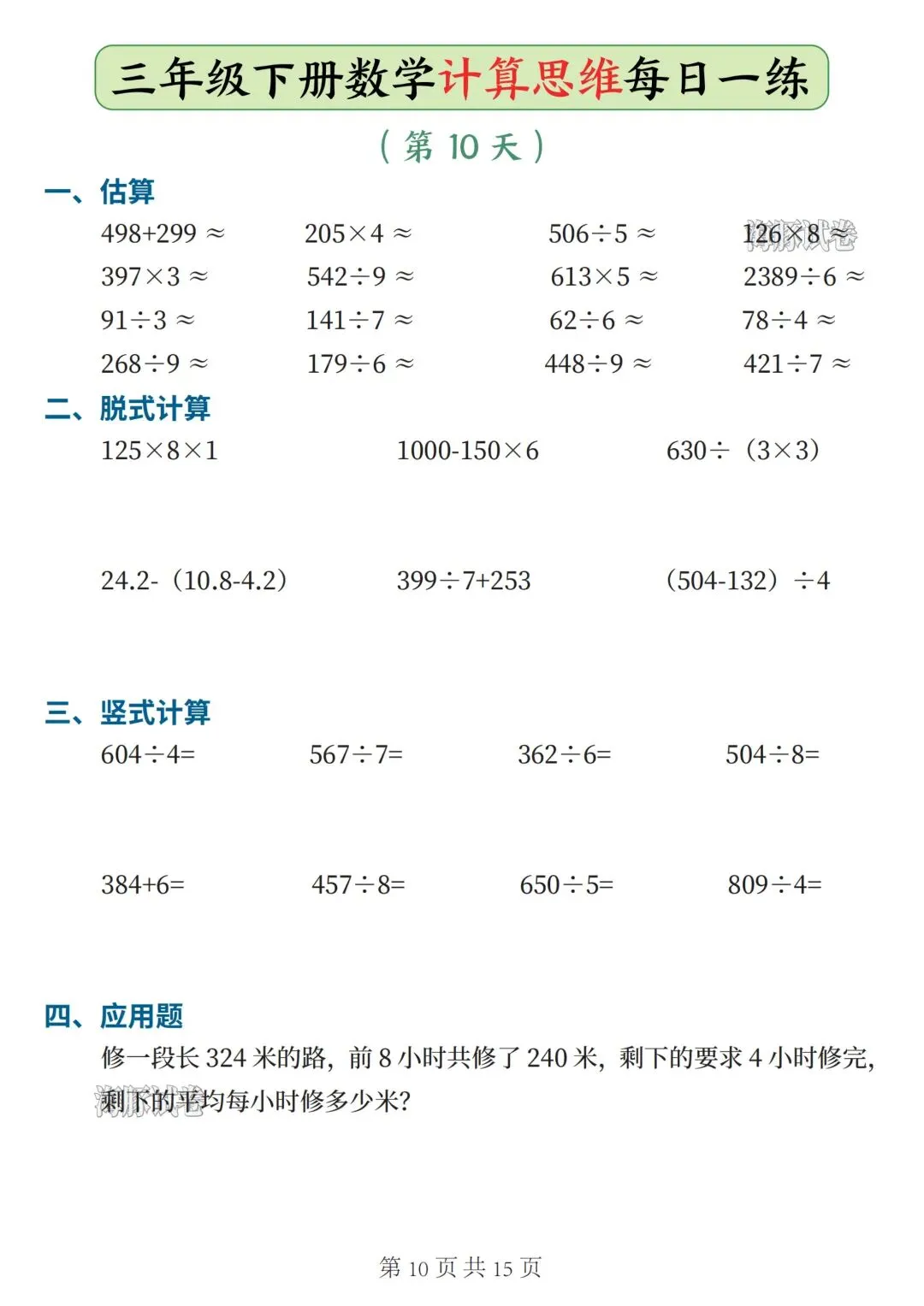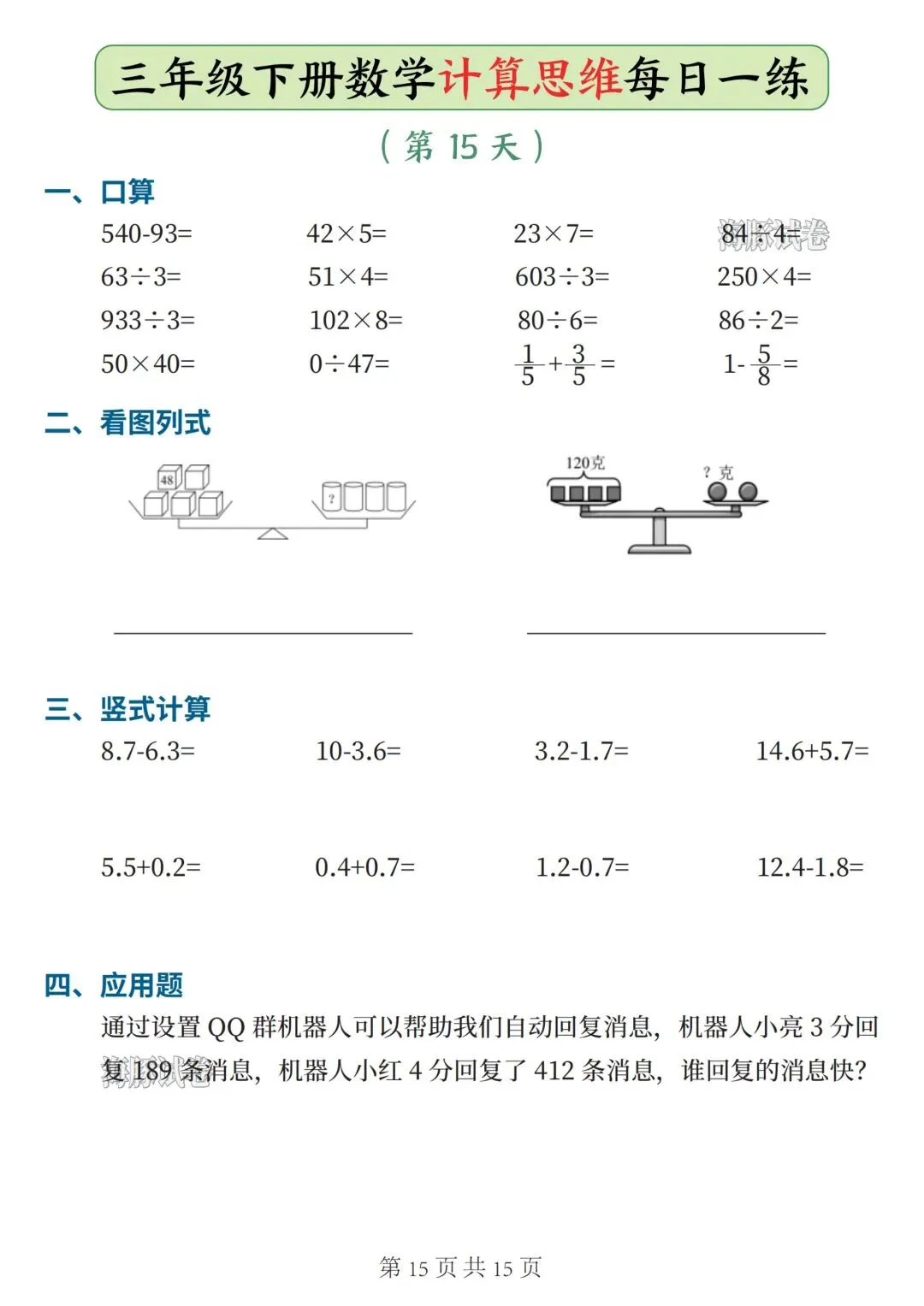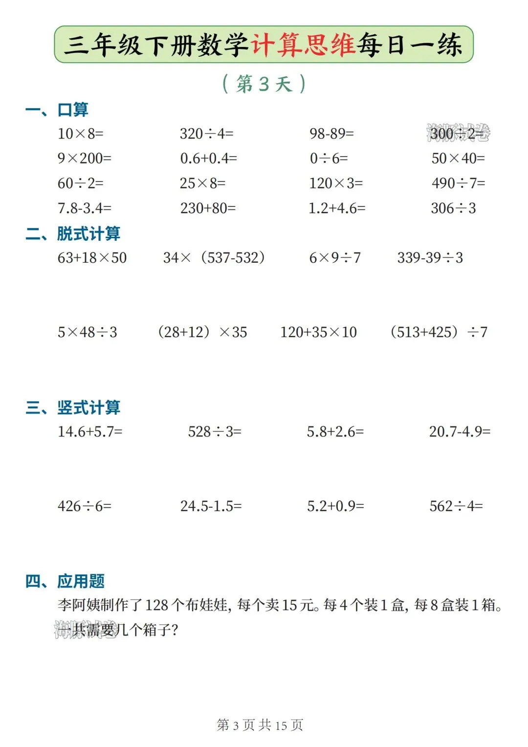 26年新版三年级下册数学计算思维每日一练,共15天,电子版可下载可打印,这份三下数学综合练习题,涵盖了口算、脱式计算、竖式计算、应用题等题型的练习,每天练一练,帮助孩子提升数学计算水平和逻辑思维能力,为三年级的数学学习奠定基础。需要的家长抓紧打印出来,让孩子练一练吧!