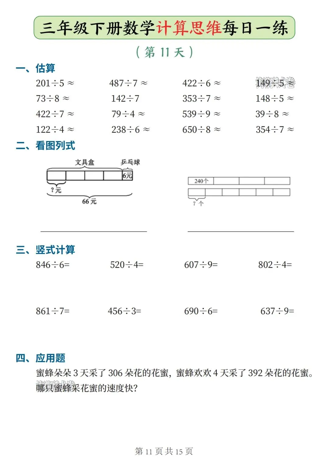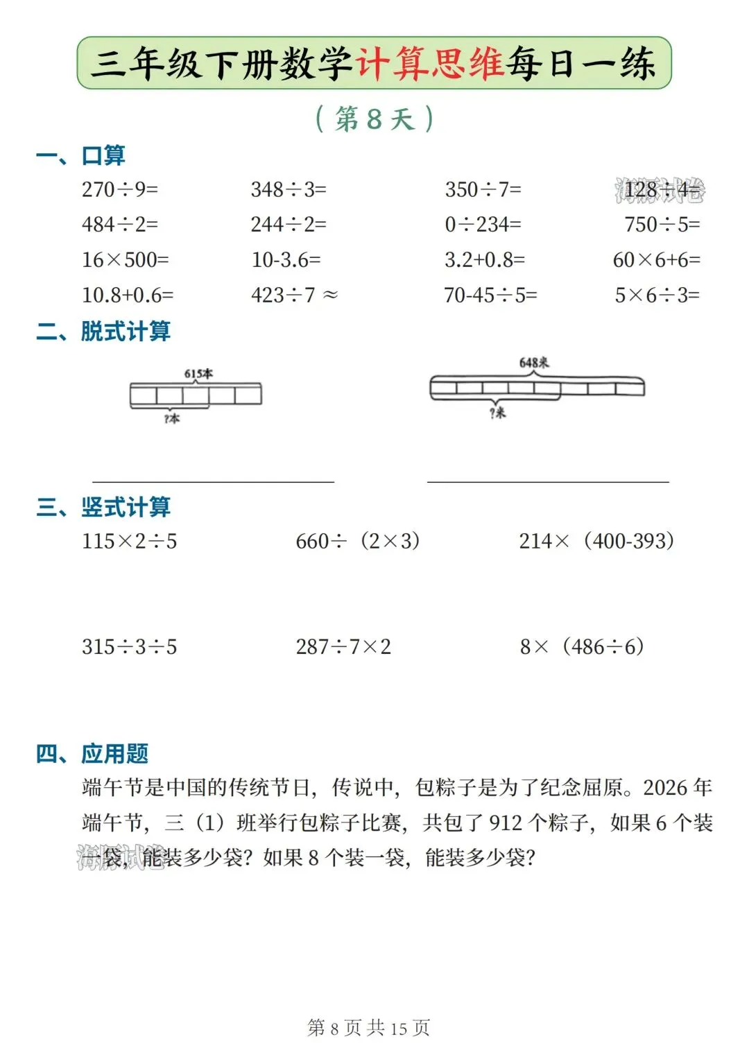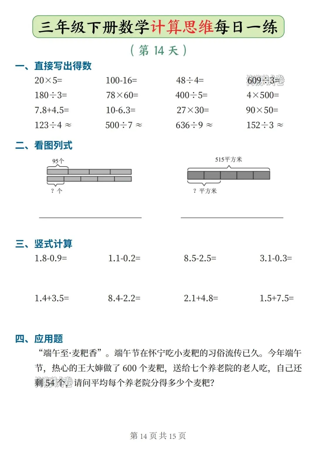 26年新版三年级下册数学计算思维每日一练,共15天,电子版可下载可打印,这份三下数学综合练习题,涵盖了口算、脱式计算、竖式计算、应用题等题型的练习,每天练一练,帮助孩子提升数学计算水平和逻辑思维能力,为三年级的数学学习奠定基础。需要的家长抓紧打印出来,让孩子练一练吧!