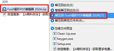 1.打开下载的福昕PDF软件安装包【Foxit福昕PDF编辑器 2024.zip】,鼠标右击压缩包选择【解压到Foxit福昕PDF编辑器 2024】。