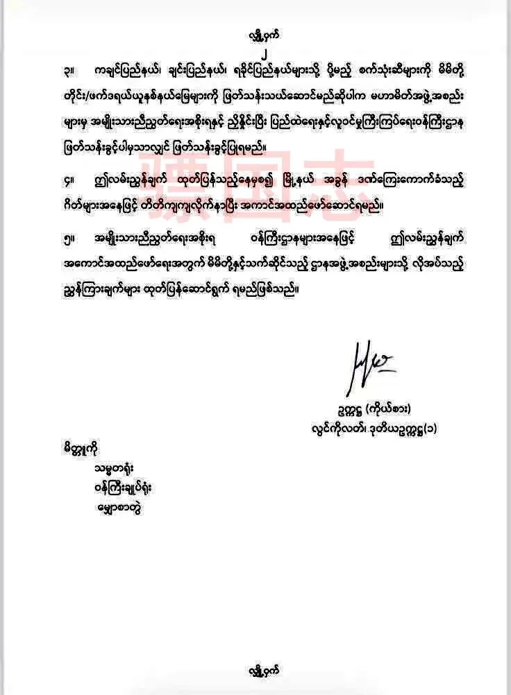 3. 若需运送至若开邦、钦邦、克钦邦的燃油须穿行我方辖区运输,则必须由盟友组织与“民族团结政府”协调,并获得“内政与移民部”的过境许可后,方可允许过境。
