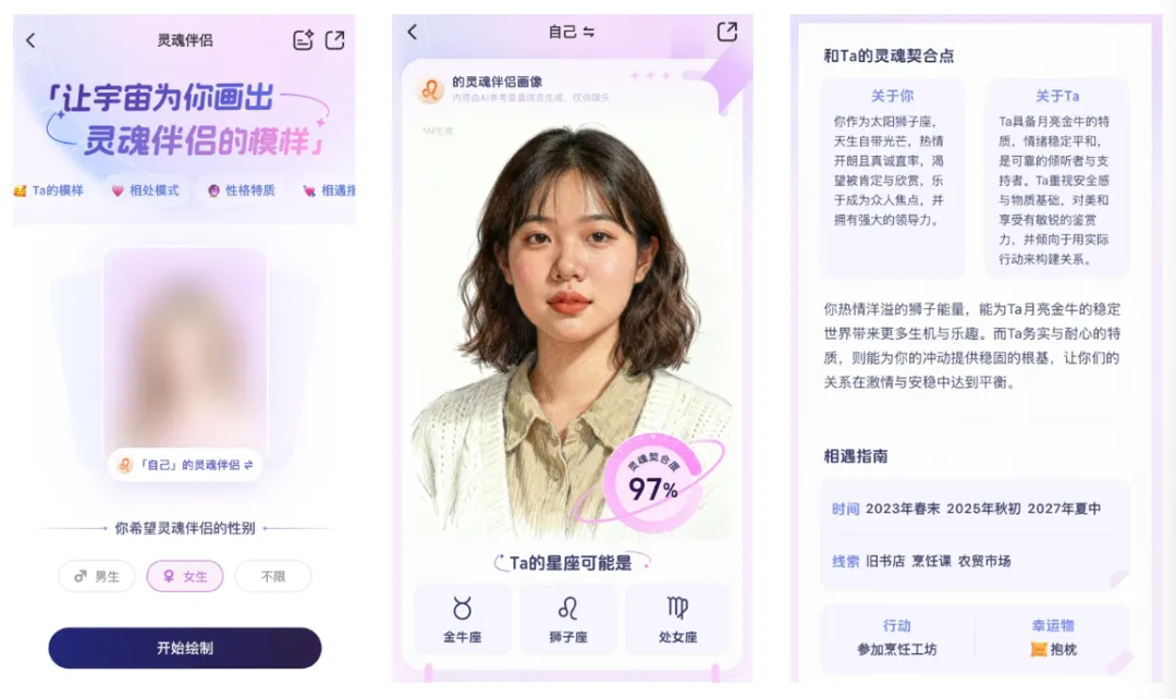 能根据你自己的档案,为你画出灵魂伴侣的样子、性格,甚至跟你说,到底咋能和你们的 Mr.right 和 Miss.right 相遇。
