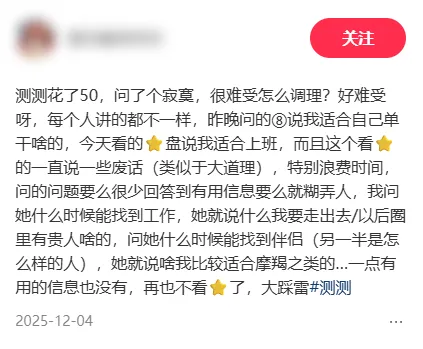 因为玄学这个东西,没有一个固定标准和答案。所以测测就无法保障达人质量。
