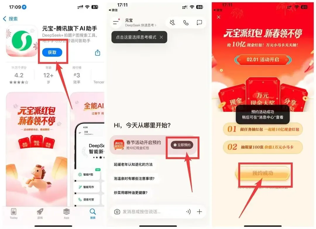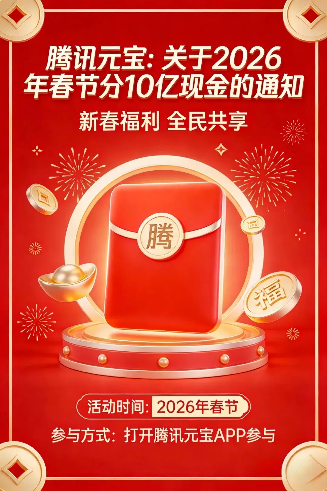 2月1日上元宝app现在预约瓜分10亿! 腾讯发布《关于春节分10亿现金的通知》:将在2月1日上线春节活动,用户上元宝APP分10亿现金红包,单个红包金额最高可达万元。 该活动设置了万元小马卡、现金红包和分享红包等红包形态,用户每天上元宝App都能领现金红包,通过做任务可抽更多红包,并有几率抽中限量100张的价值1万元现金小马卡。分享红包支持转发给微信、QQ好友和社群,让元宝出钱、好友拆红包。 操作流程:去应用商店下载:腾讯元宝 首页春节预约 2.1号瓜分10亿