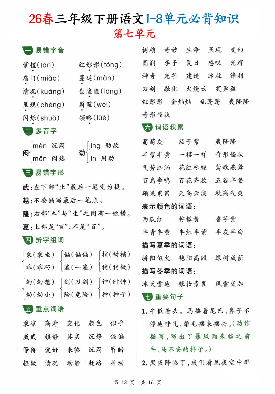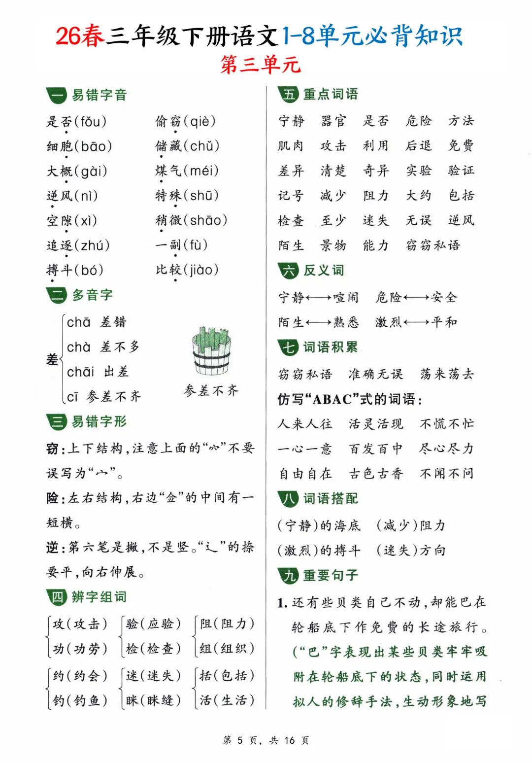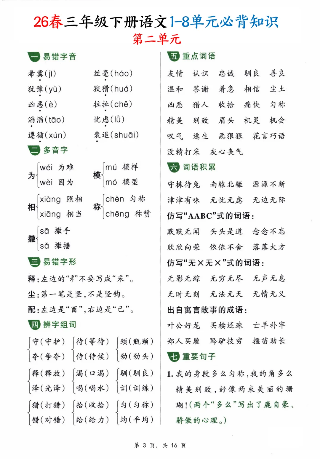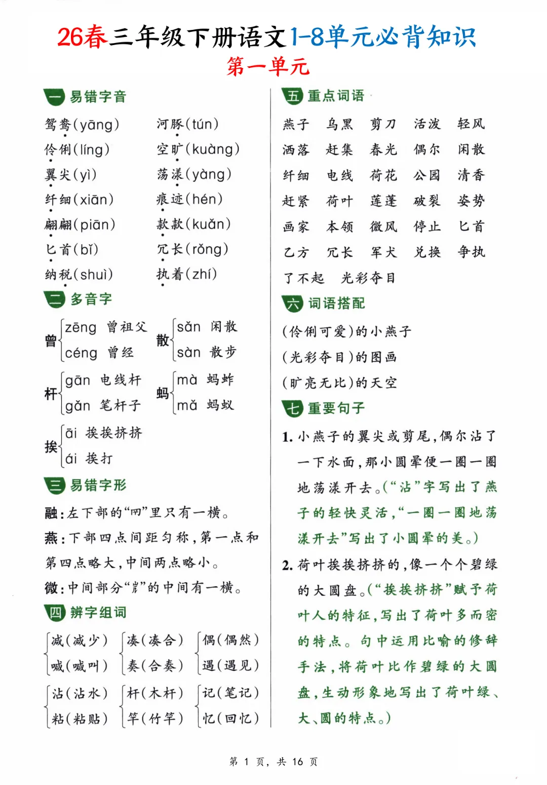 【三年级下册语文】【人教部编版】1-8单元必背知识汇总共16页丨完整高清可打印