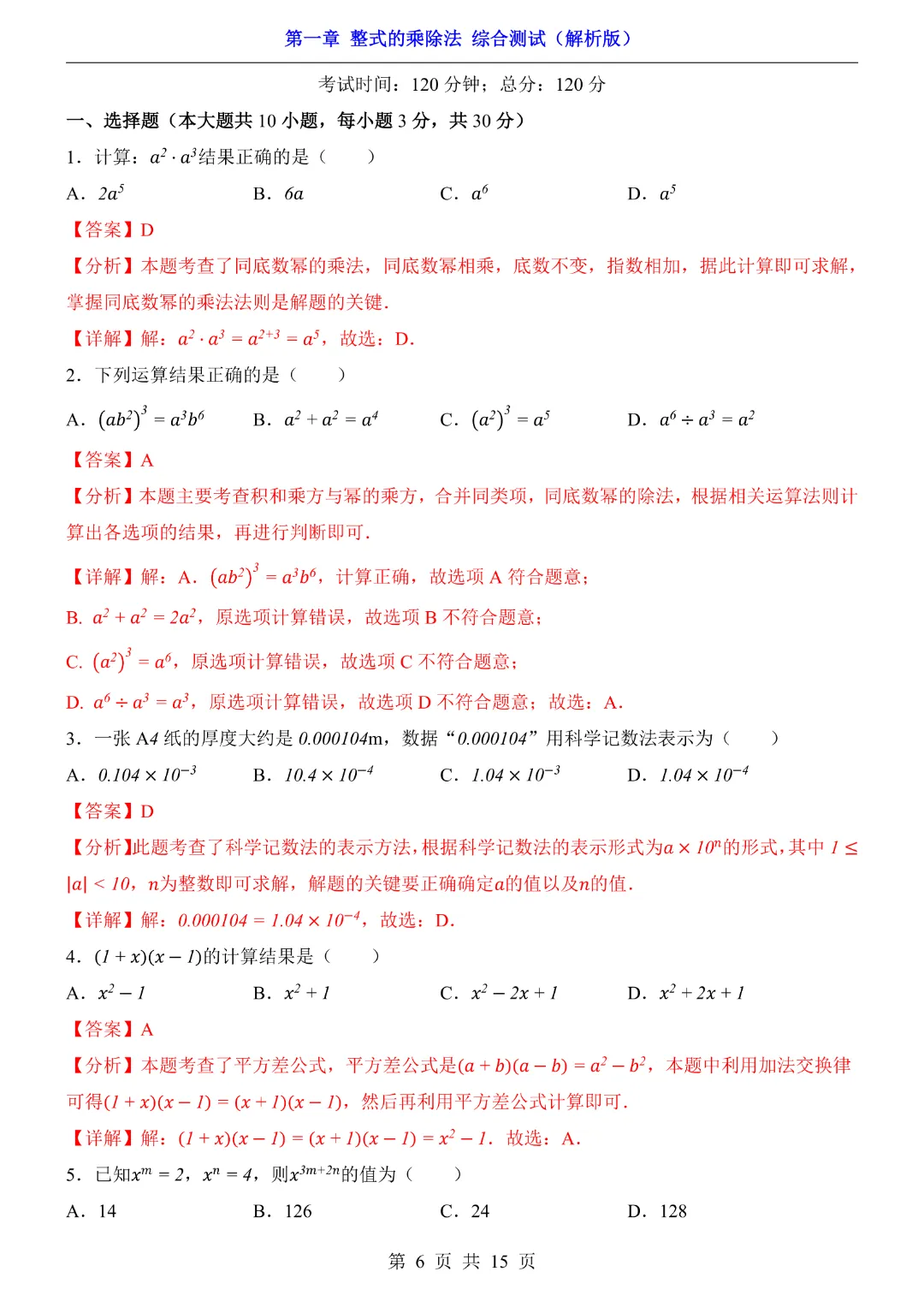 七年级下册数学【北师版】第1章 整式的乘除综合测试带答案丨完整电子版