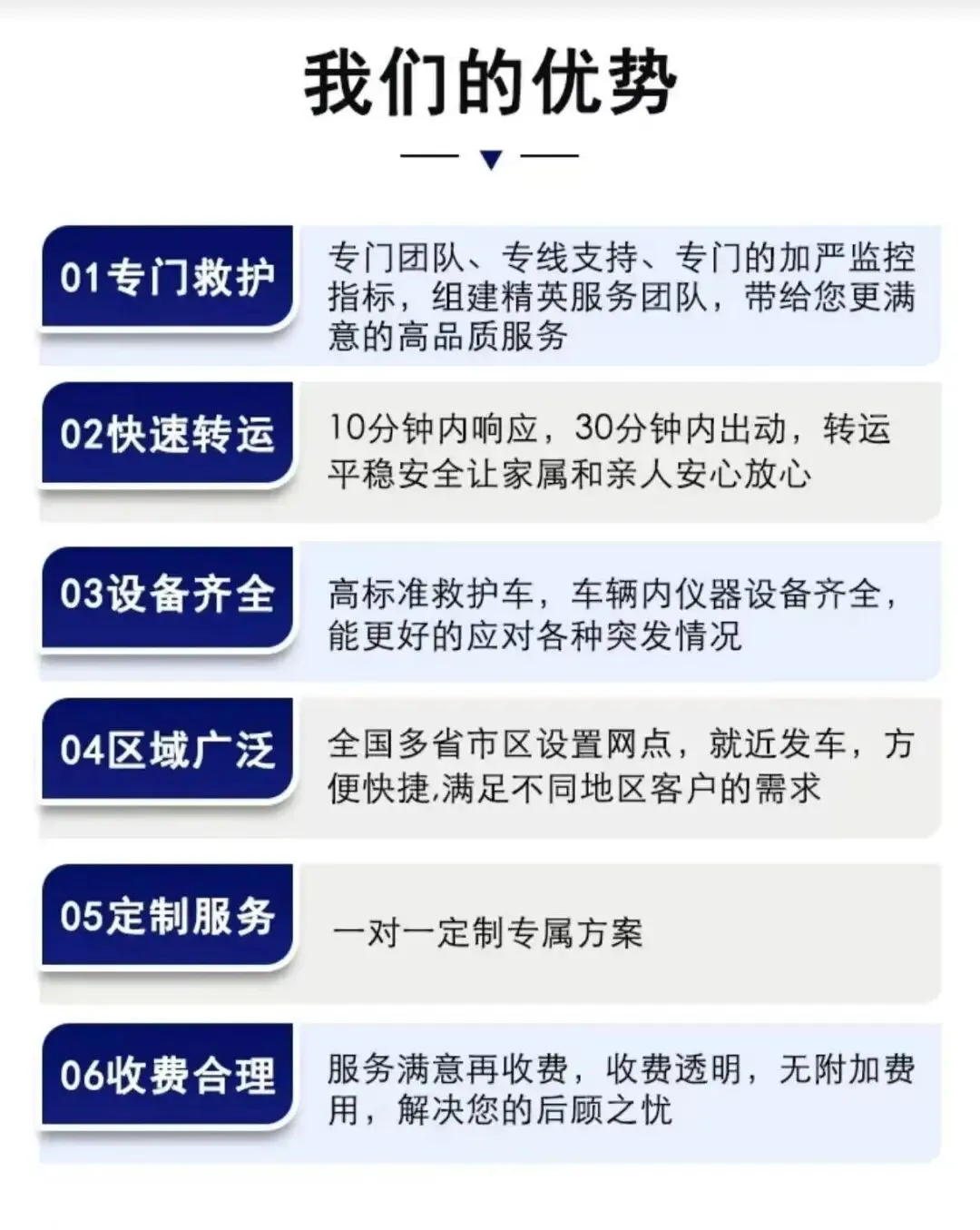 在医疗转运的道路上,我们始终以患者为中心,用专业的技术满足各类需求,用透明的收费赢得长久信任。我们是经卫生部门批准的正规救护车转运护送公司,愿成为您健康路上的忠实伙伴。