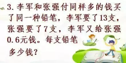 根据两人付同样多的钱买同一种铅笔和李军要了13支,张强要了7支,可知每人应该得(13+7)÷2支,而李军要了13支比应得的多了3支,因此又给张强0.6元钱,即可求每支铅笔的价钱。