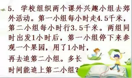 第一小组停下来参观果园时间,第二小组多行了[3.5-(4.5-3.5)]千米,也就是第一组要追赶的路程。又知第一组每小时比第二组快(4.5-3.5)千米,由此便可求出追赶的时间。