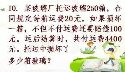 根据已知托运玻璃250箱,每箱运费20元,可求出应付运费总钱数。根据每损坏一箱,不但不付运费还要赔偿100元的条件可知,应付的钱数和实际付的钱数的差里有几个