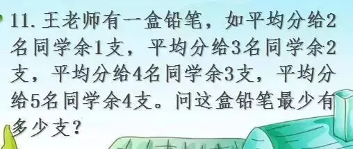 根据题意,可以将题中的条件转化为:平均分给2名同学、3名同学、4名同学、5名同学都少一支,因此,求出2、3、4、5的最小公倍数再减去1就是要求的问题。