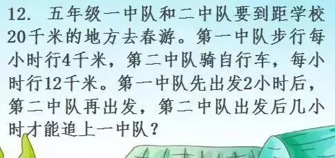 因第一中队早出发2小时比第二中队先行4×2千米,而每小时第二中队比第一中队多行(12-4)千米,由此即可求第二中队追上第一中队的时间。