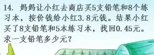 从总钱数里去掉8个练习本比8支铅笔贵的钱 数,剩余的则是(5+8)支铅笔的钱数。进而可求出每支铅笔的价钱。