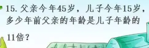 父、子年龄的差是(45-15)岁,当父亲的年龄是儿子年龄的11倍时,这个差正好是儿子年龄的(11-1)倍,由此可求出儿子多少岁时,父亲是儿子年龄的11倍。又知今年儿子15岁,两个岁数的差就是所求的问题。