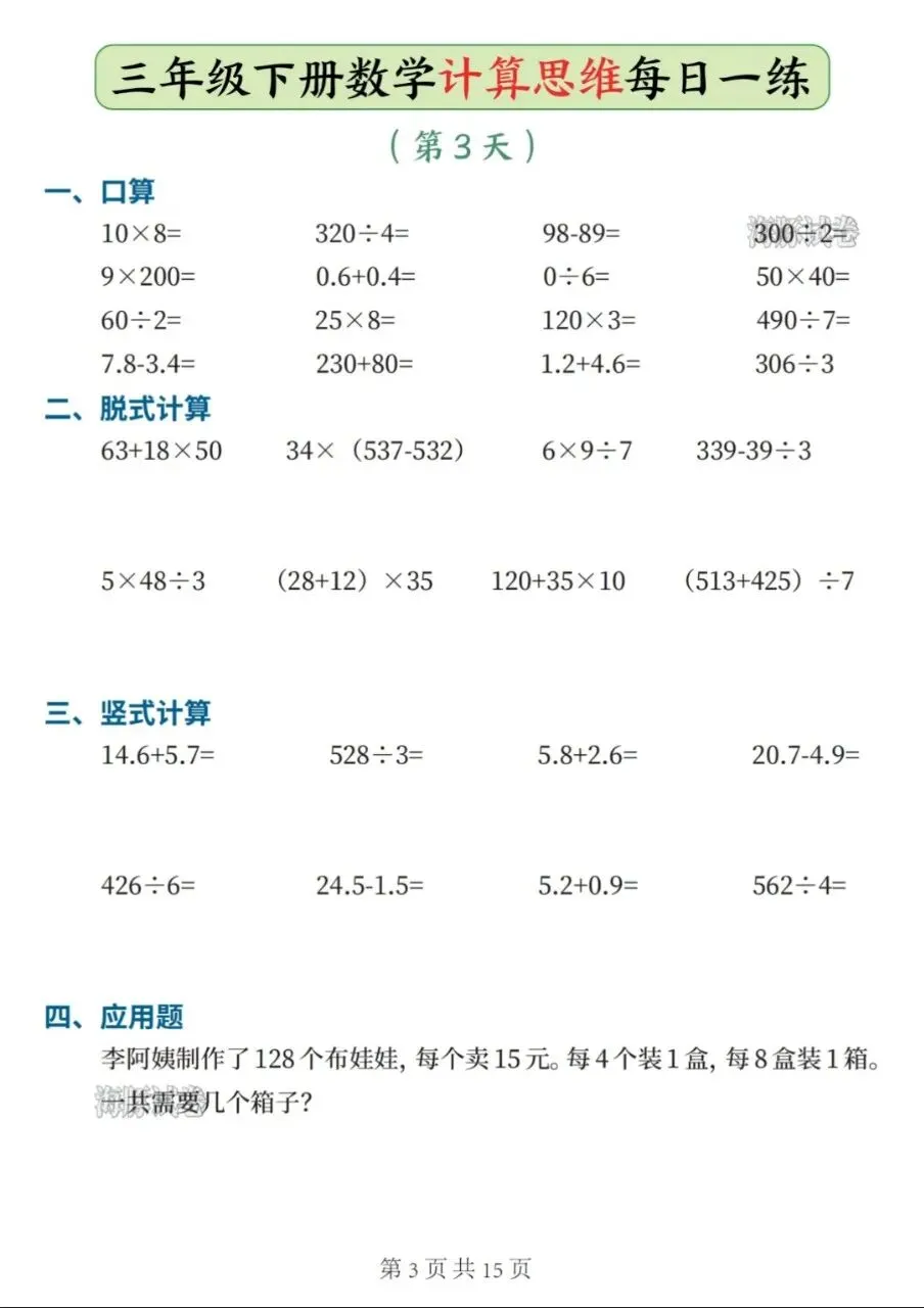 三年级下册数学(计算思维每日一练),电子版可打印