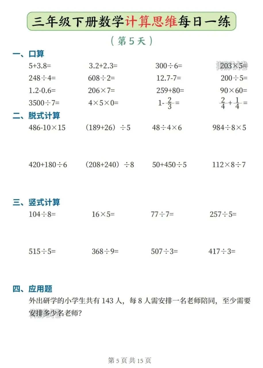 ✅ 涵盖口算、脱式计算、竖式计算、应用题