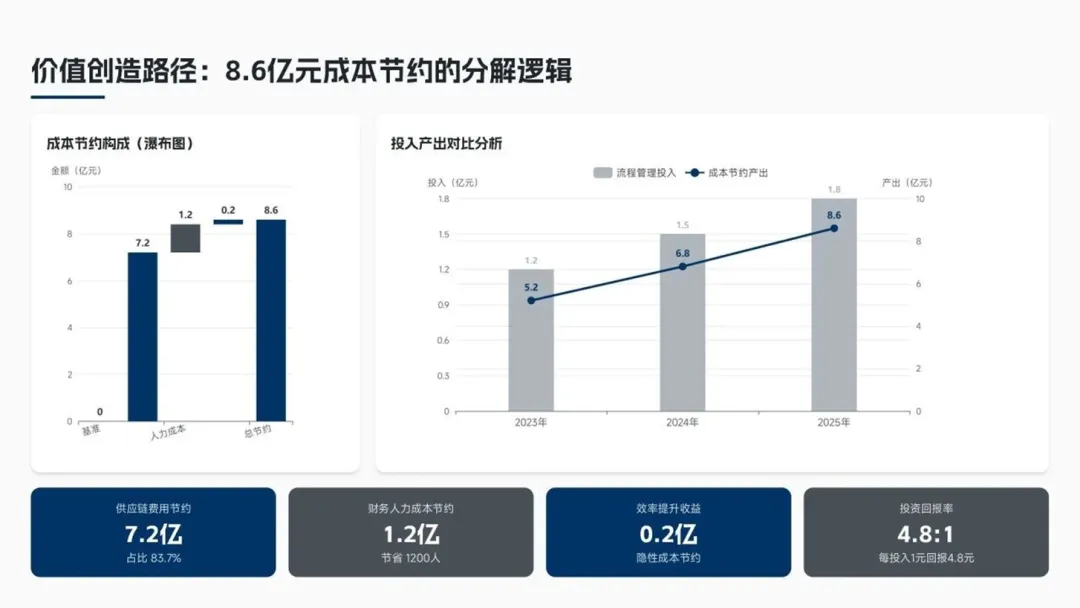 - 成本节约:总计8.6亿元,投资回报率达4.8:1。