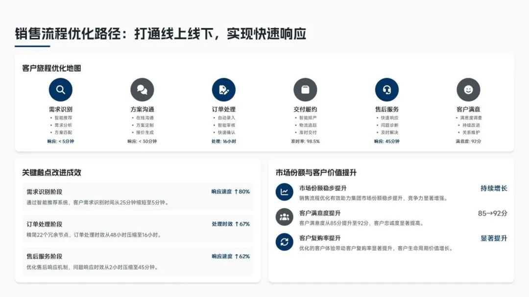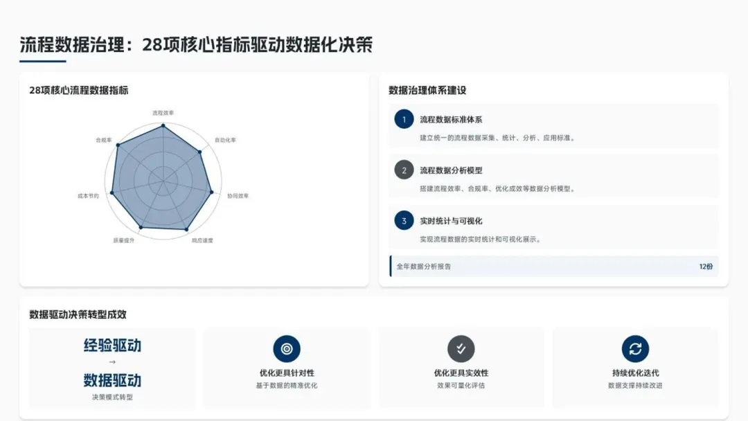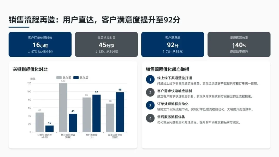 再造“用户直达”流程,客户订单处理时效从48小时降至16小时(↓67%),客户满意度达92分。 - 职能管理流程
