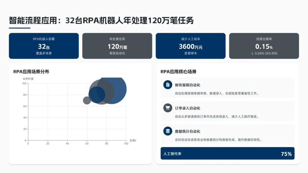 流程线上化率提升至98.5%;部署32台RPA机器人,年处理任务120万笔。 - 协同机制