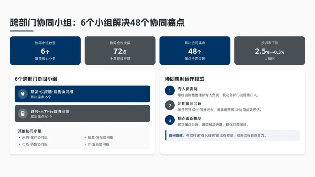 成立6个跨部门协同小组,解决48个协同痛点,端到端流程协同效率提升45%。通过设立占绩效权重15%的协同考核机制,跨部门投诉率降至0.3%。