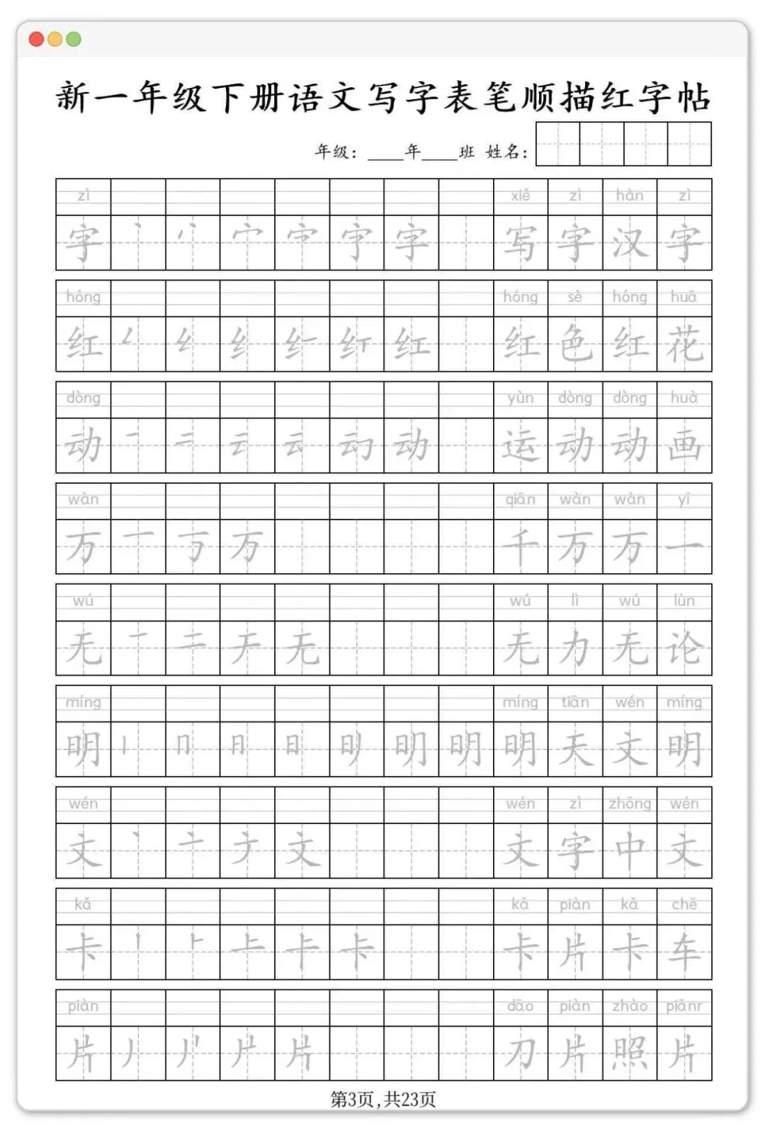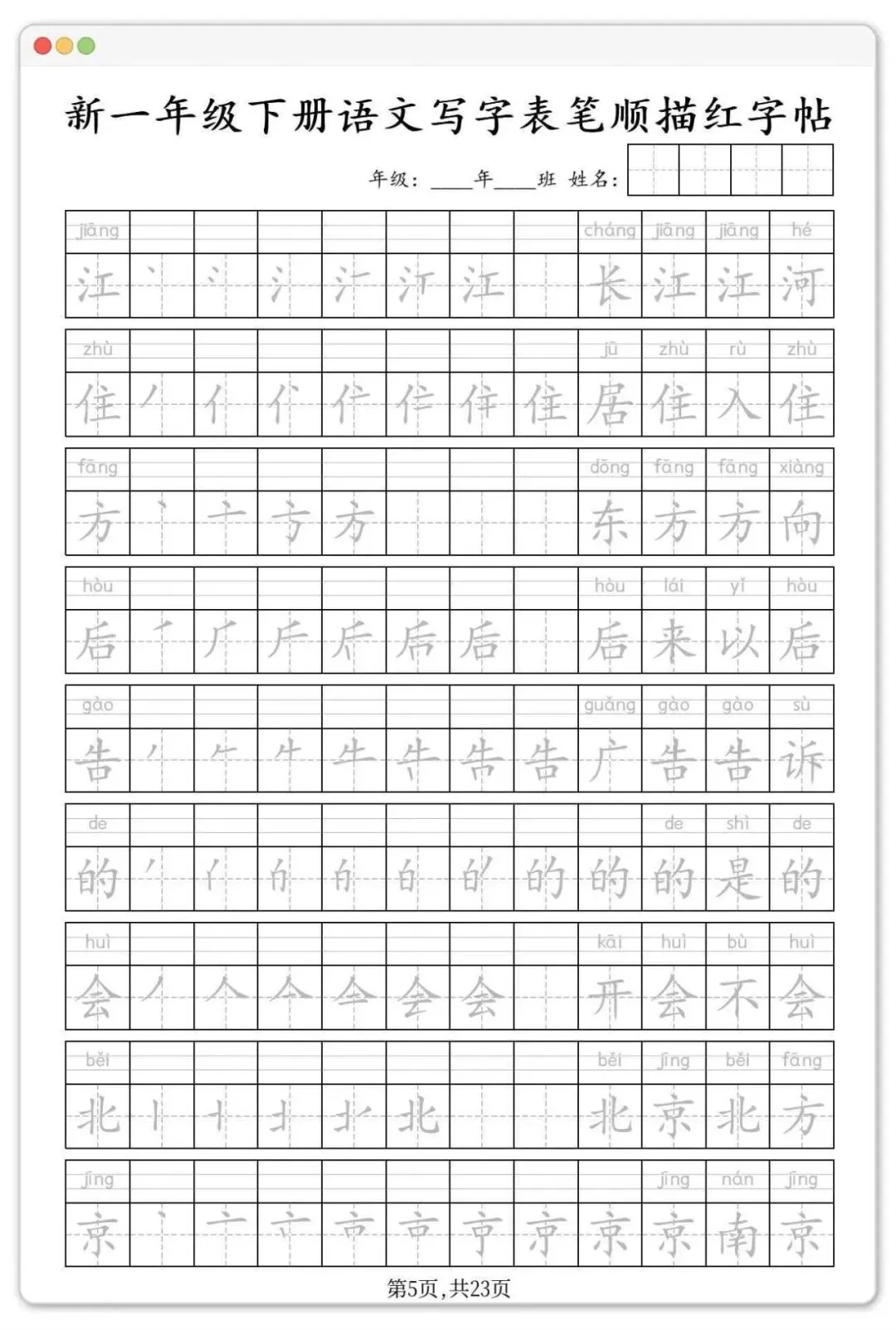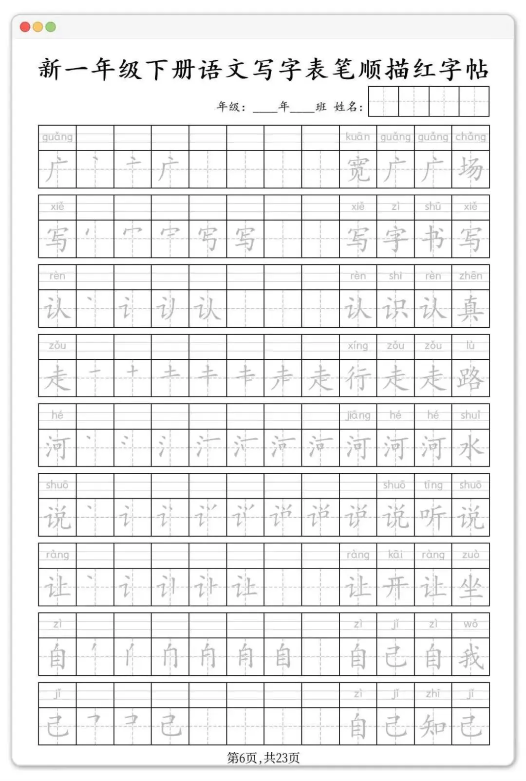 一年级语文下册写字表笔顺描红帖,23页可打印