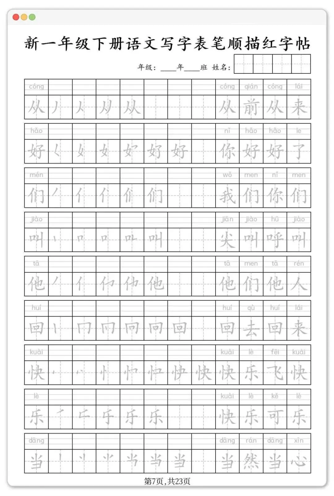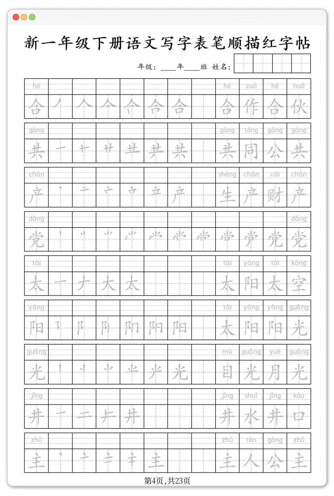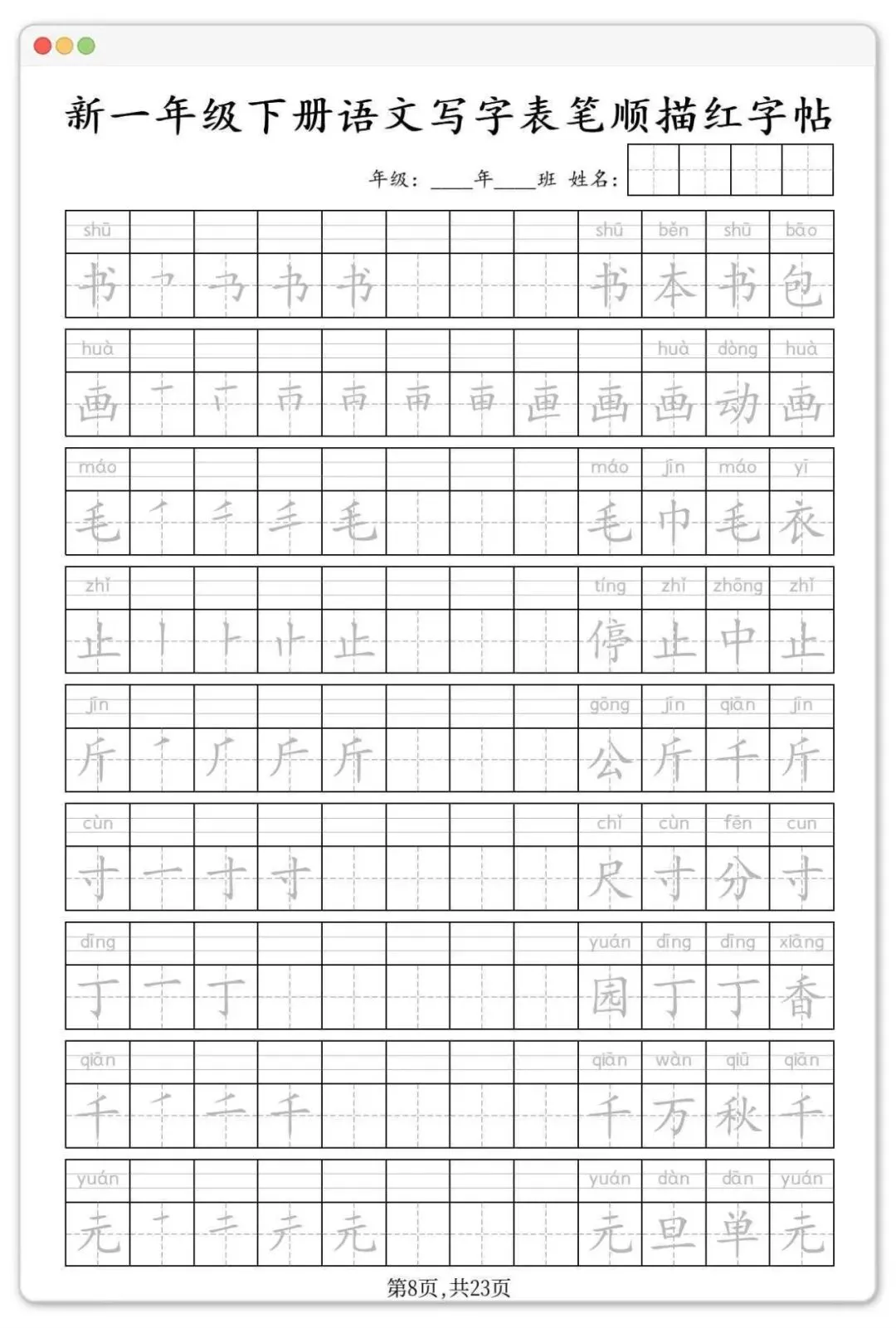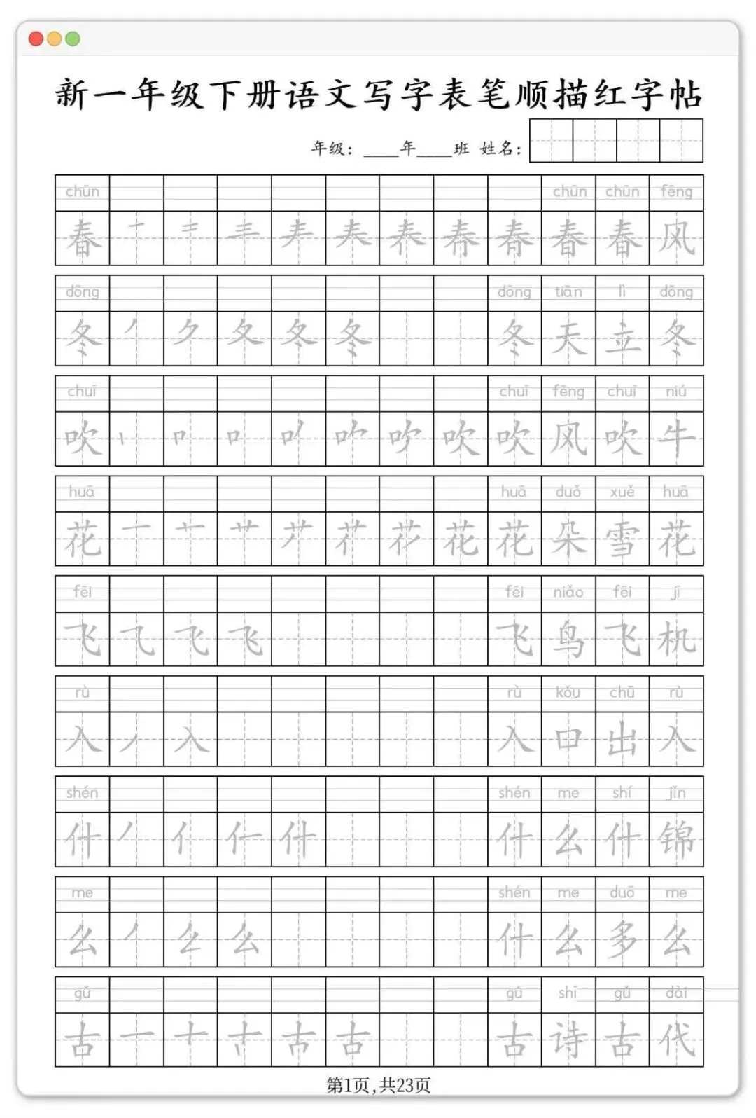 一年级语文下册写字表笔顺描红帖,23页可打印