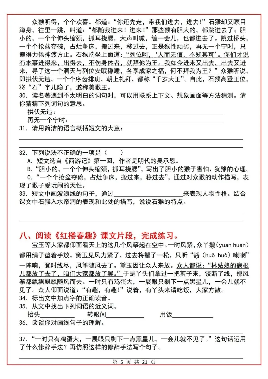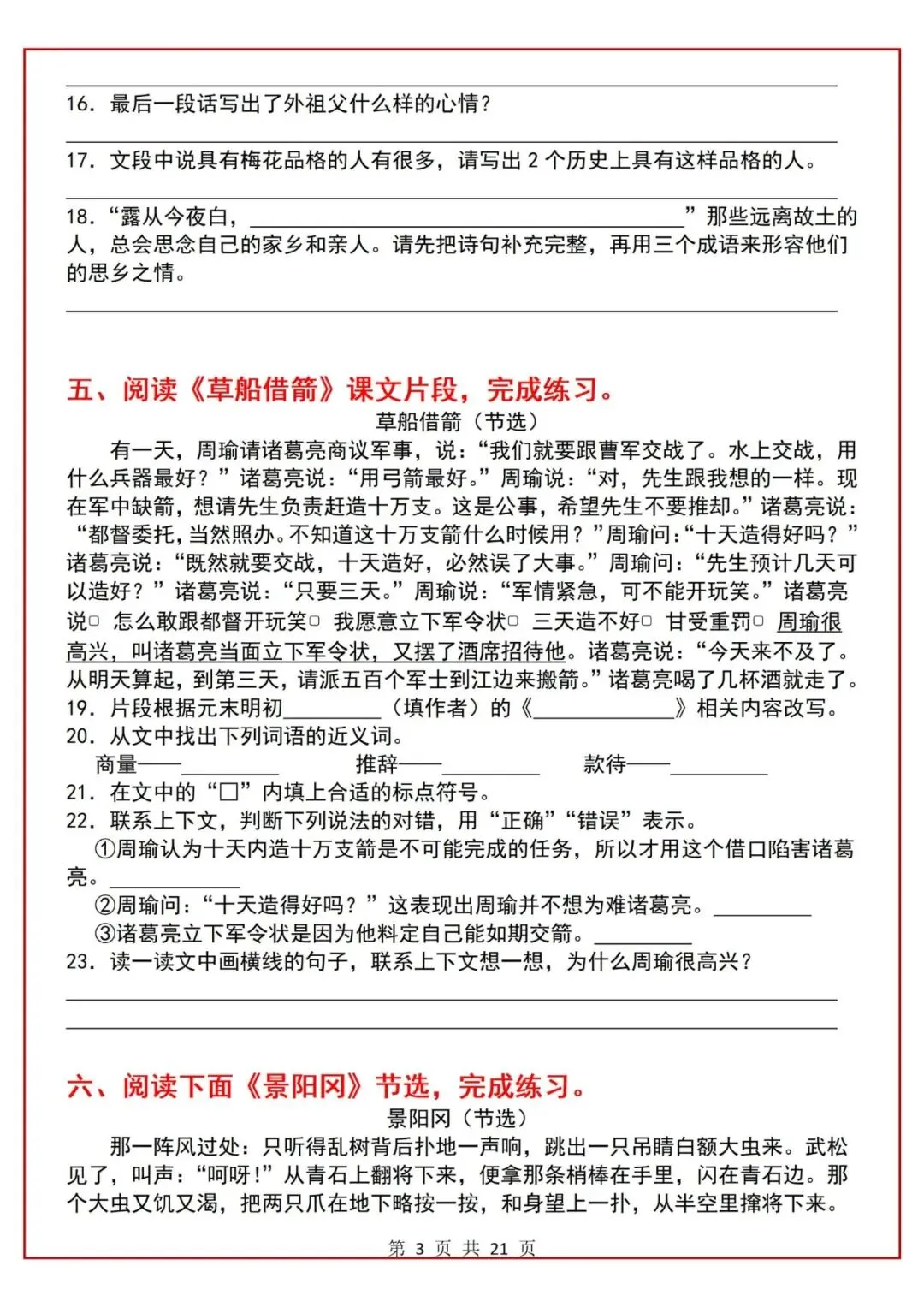 五年级下册语文课内阅读理解每课一练(电子版可打印)