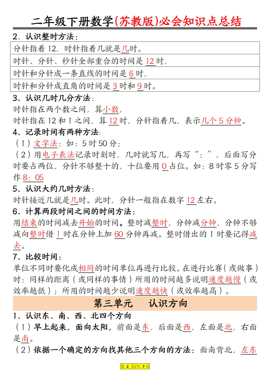 【免费下载】二年级(下)数学 必会知识汇总《苏教版》,PDF电子版,共7页,可打印
