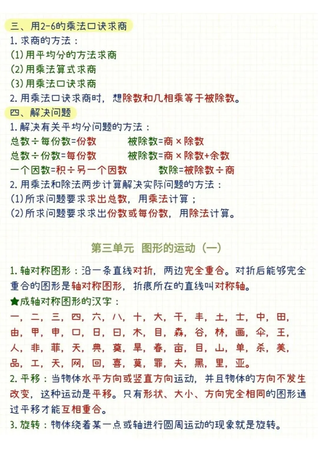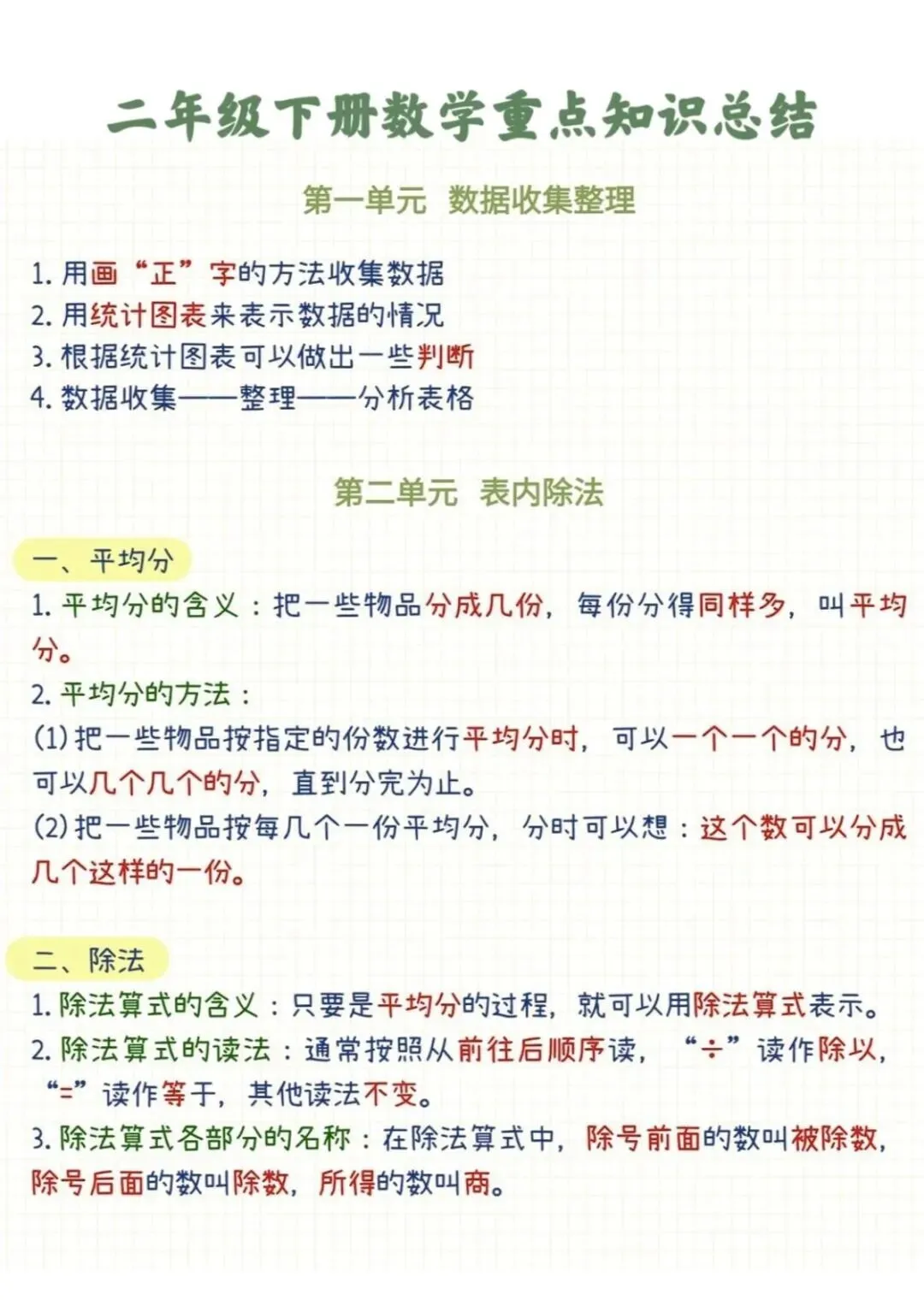 【免费下载】二年级(下)数学 全册重点知识总结《人教版》,PDF电子版,共5页,可打印
