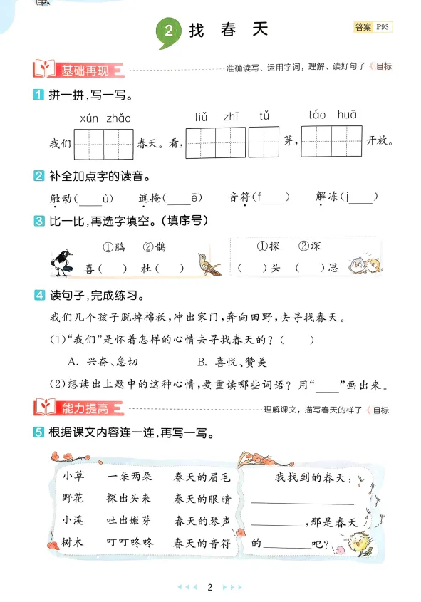 ✅ 分层设计,循序渐进:采用“基础+提升+拓展”的递进练习模式——基础层夯实字词(看拼音写词语、多音字辨析),提升层深化表达储备(课文理解、仿写句子),拓展层提升综合能力(阅读素养练习),刚好匹配二年级“从输入到输出”的能力升级节奏-1-3。