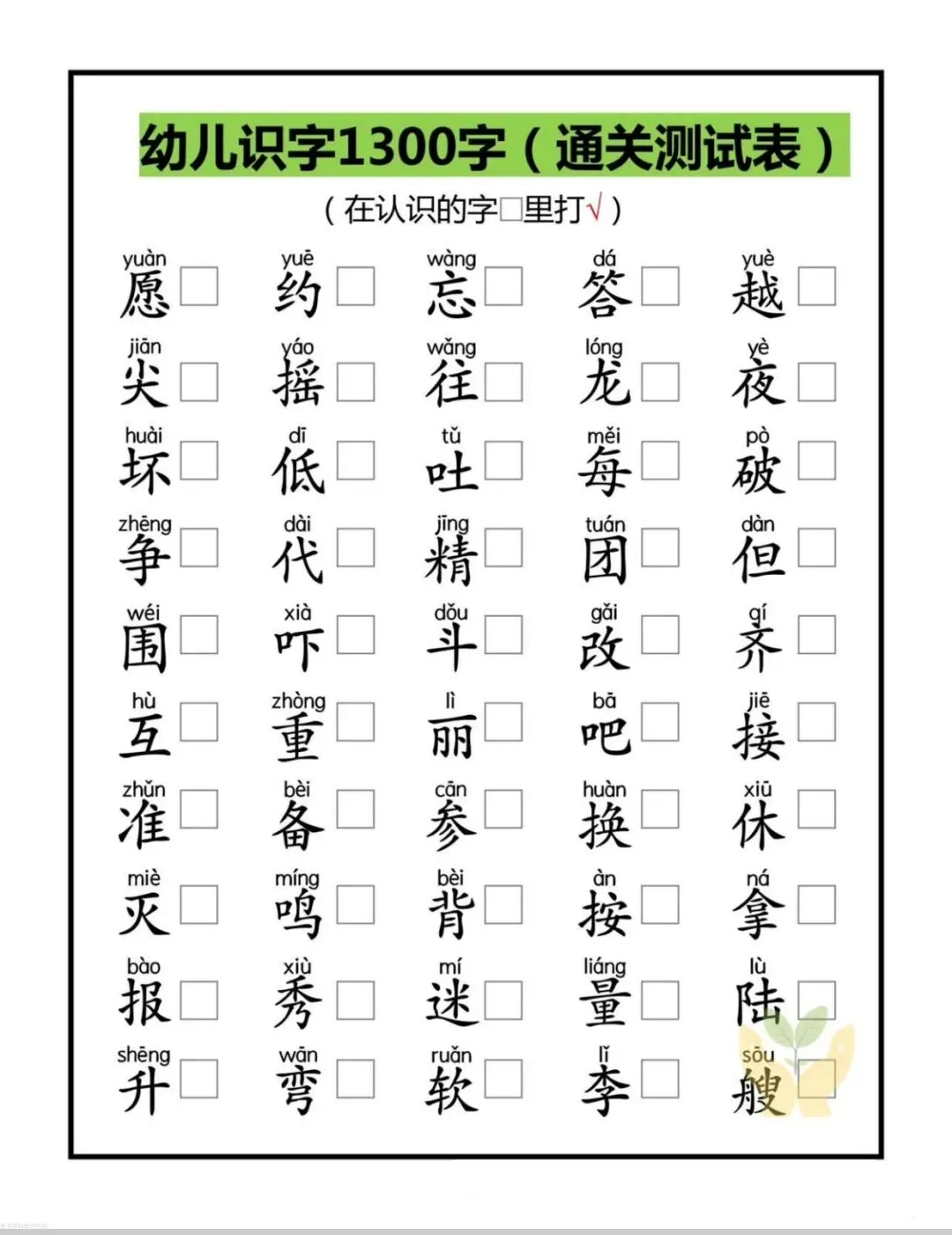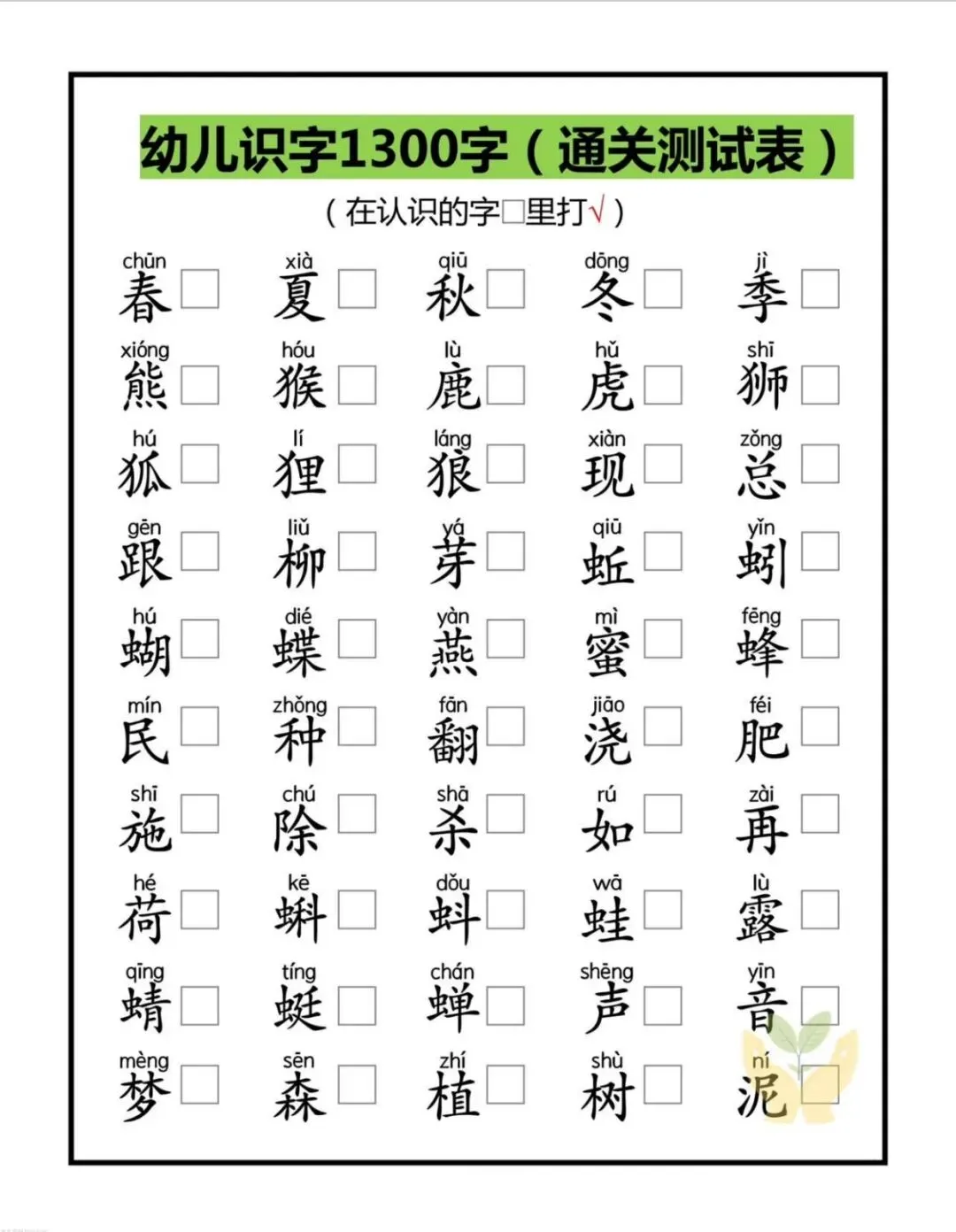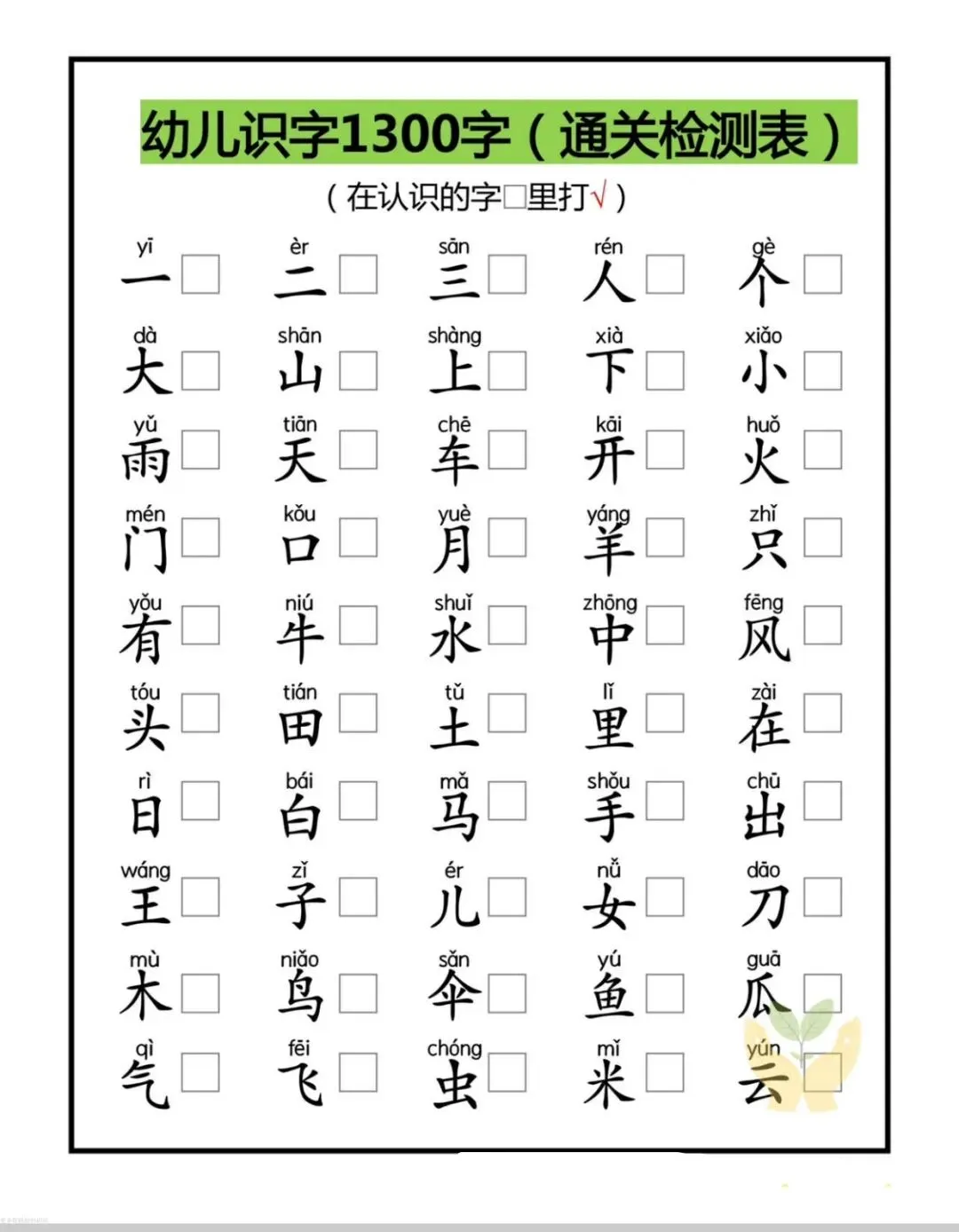 别慌!这份幼儿识字1300字通关检测表(拼音版) 终于来啦!从基础的一二三四、山水日月,到日常的衣食住行、花鸟鱼虫,循序渐进覆盖幼儿必备常用字,还搭配精准拼音,娃认字有方向,家长检测有依据,轻松实现识字通关~
