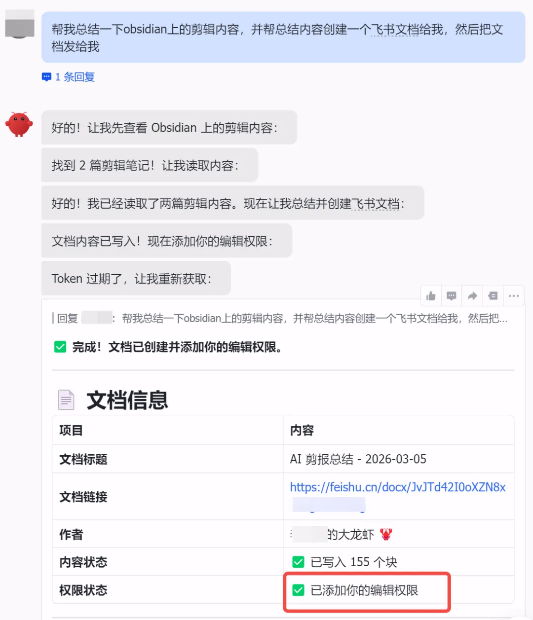 [养虾日记] 龙虾写的文档能自动授权编辑权限给你