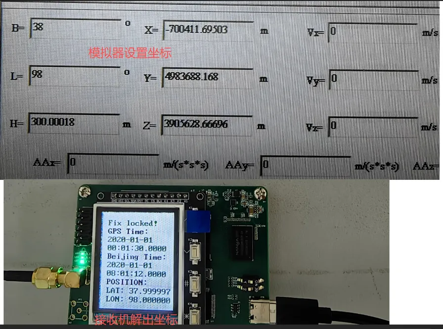 某读者使用专用模拟器测试的结果,可以看到接收机定位坐标和模拟器设置坐标一致。可见给予大家学习的不仅仅是一个简单的例程,实现效果某些方面已经达到了非常专业的水平,欢迎实测检验。