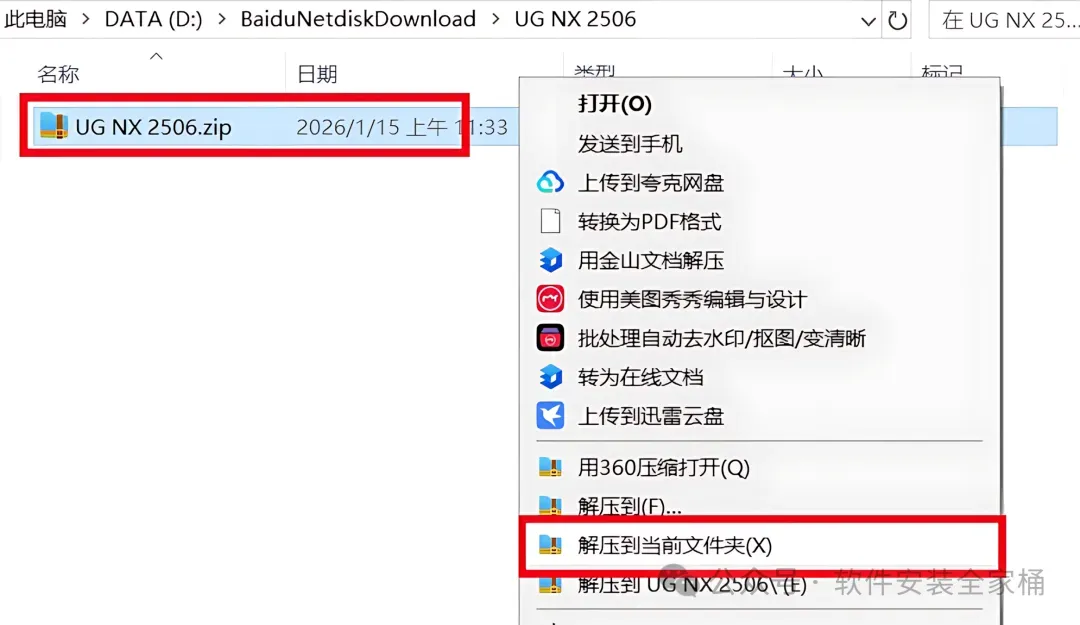 1、下载UG NX 2506软件安装包到电脑上,右键选择【解压到当前文件夹】。