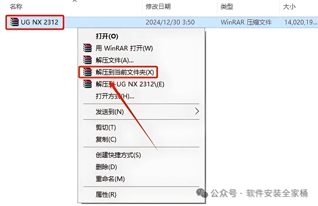1.打开下载的UG安装包,鼠标右击压缩包,选择【解压到当前文件夹】。