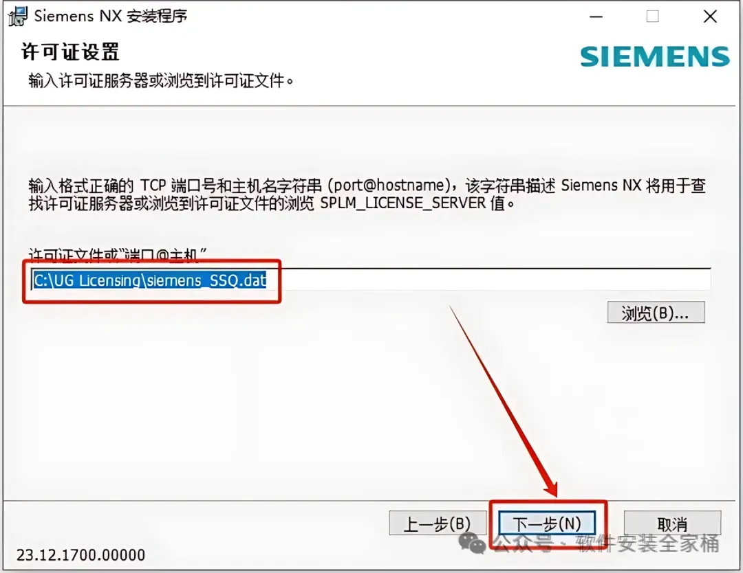 19.复制【C:\UG Licensing\siemens_SSQ.dat】,然后粘贴到”端口@主机“处,接着点击【下一步】。