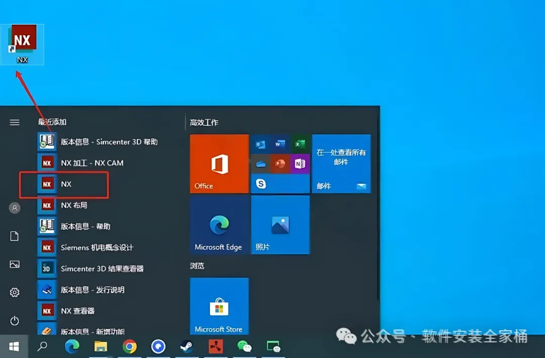 23.在桌面左下角开始菜单栏中找到【NX】软件,鼠标拖拽到桌面上即可创建桌面启动方式。