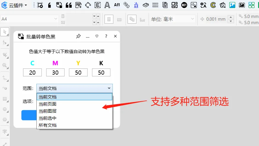 功能简介:该插件功能实现了灵活的四色黑转单色黑(转黑)功能,可自定义CMYK色值,默认CMYK全部为50,也可以根据需要自定义默认值。