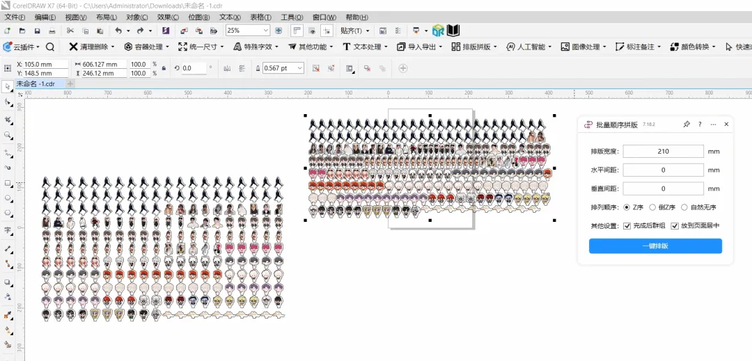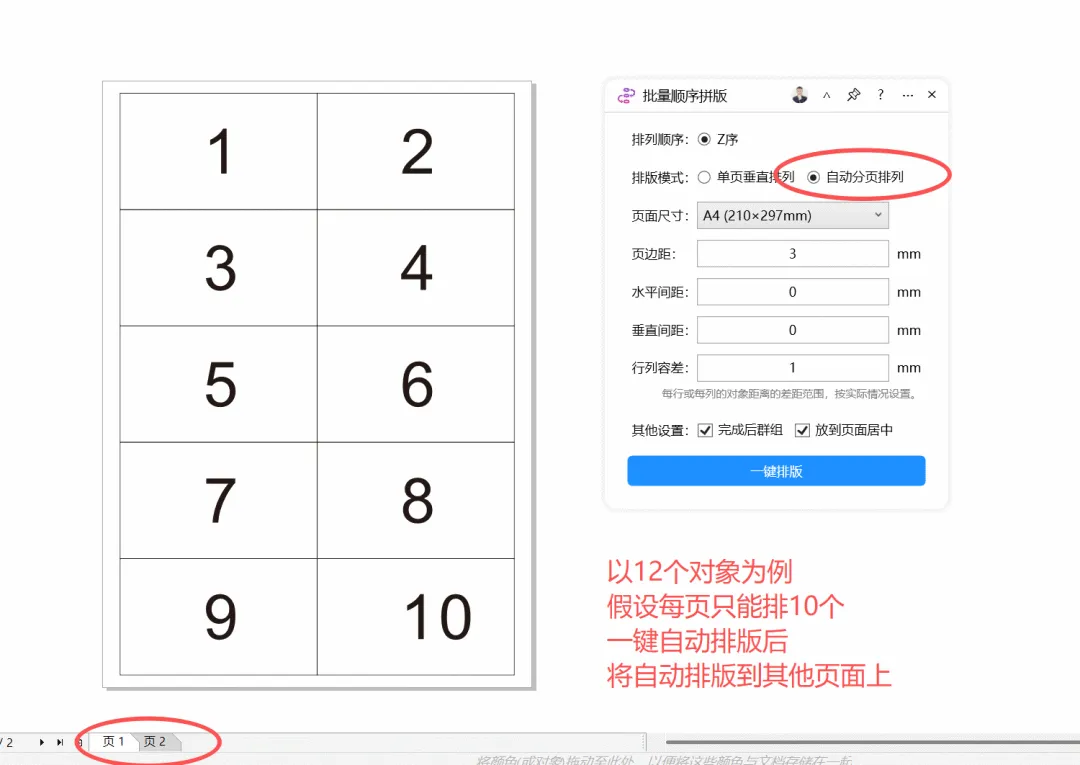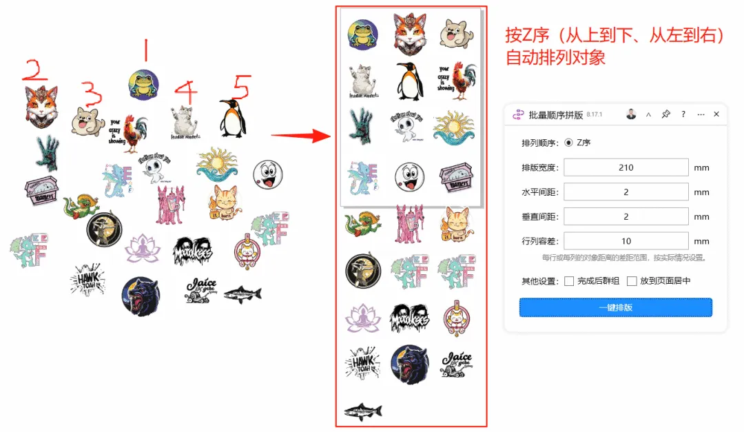 功能简介:该插件可实现将选定的多个对象在固定的版面内部按照从左到右、从上到下的顺序进行一键拼版(排版),可以设置上下左右的间距。