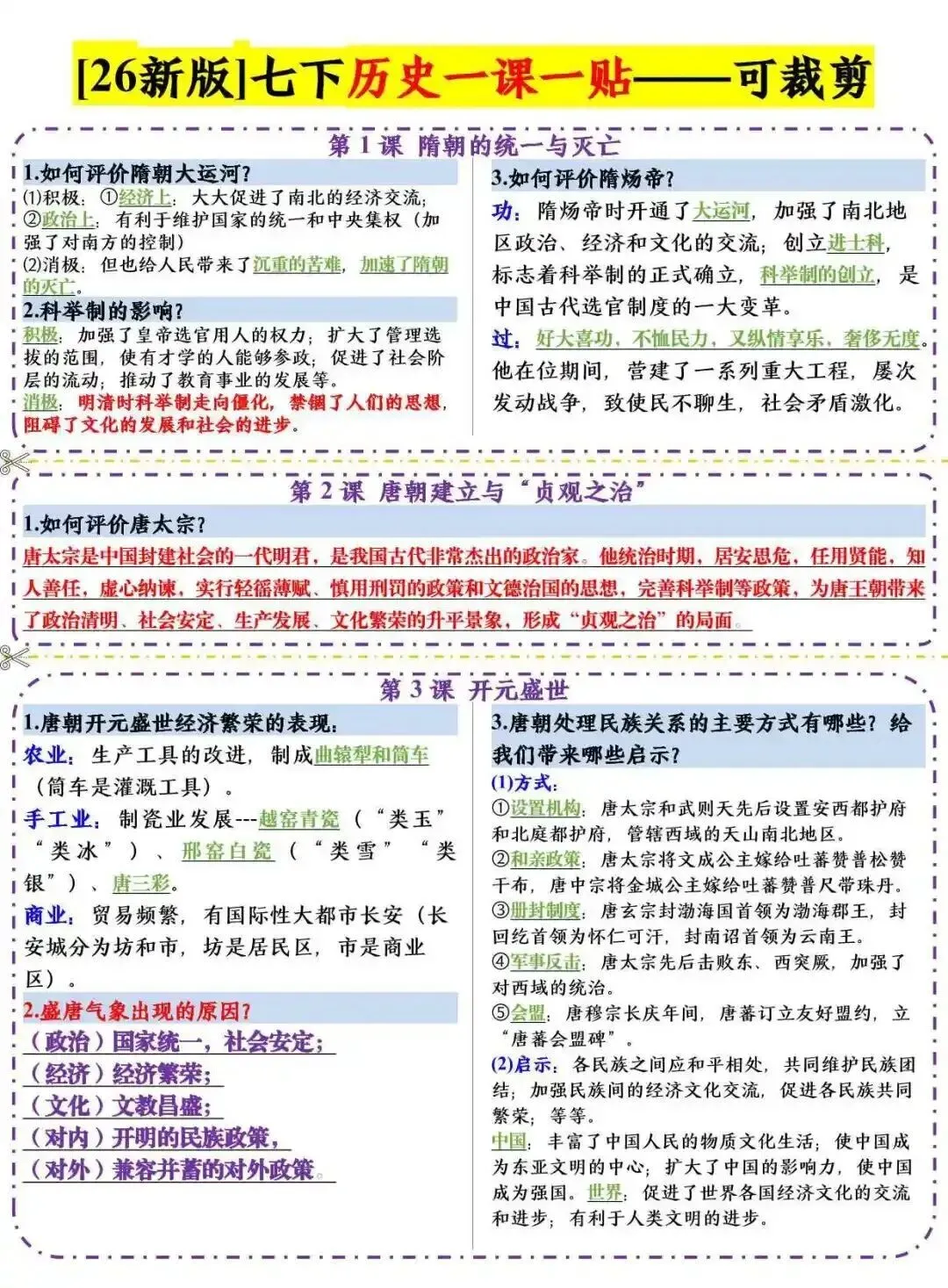今天给大家分享的是26春七年级下册历史彩色课课贴,把每课的核心史实、时间线、高频考点都精准提炼,不用再花费大量时间手抄笔记。彩色排版巧用心思,用不同色彩区分重难点、易混点,孩子一眼就能抓住得分关键,记忆更深刻。