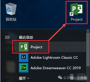 6.安装完成后会自动关闭界面,因WIN10系统不自动创建桌面图标,点击电脑桌面左下角的“开始”按钮在弹出的程序列表中找到Project2019快捷方式,鼠标左键按住不放直接拖拽至电脑桌面即可生成Project 2019图标,方便以后打开。