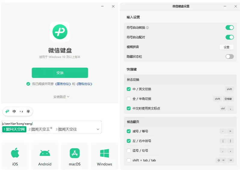 微信键盘是微信官方出品的中文输入法,适用于Windows 7及以上系统版本。