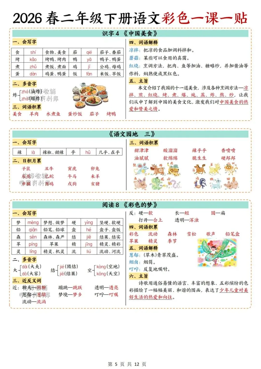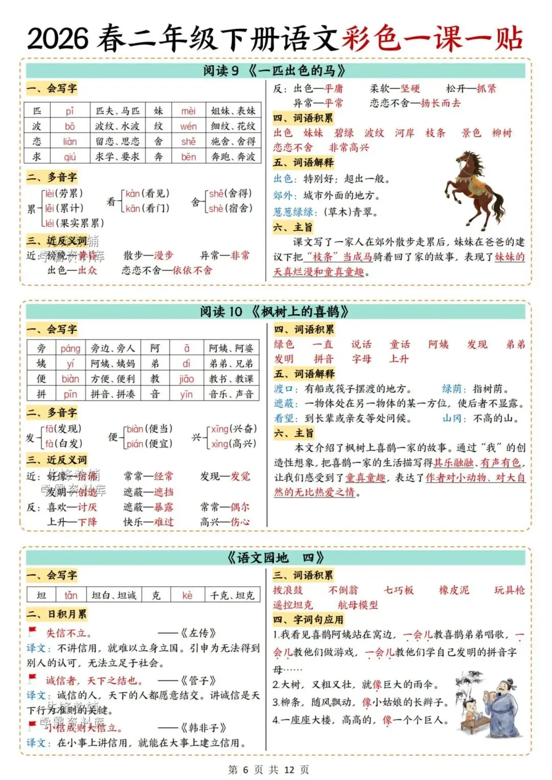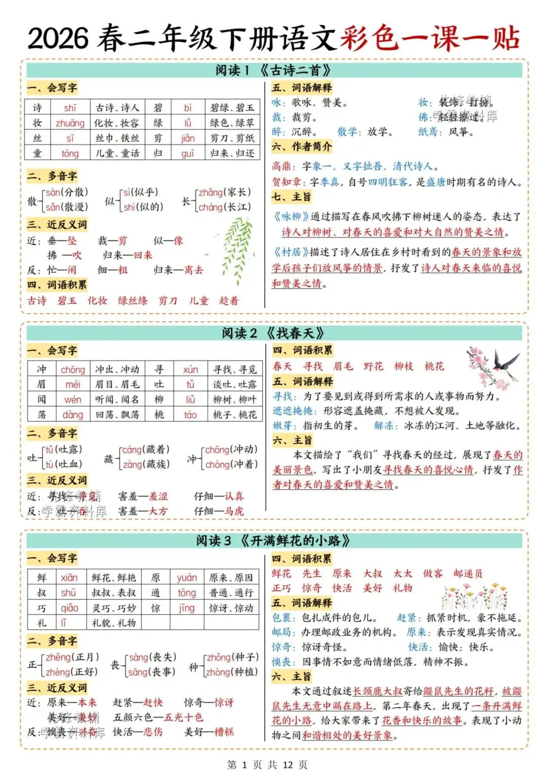 26春新二年级下册语文彩色一课一贴|完整电子版可打印。