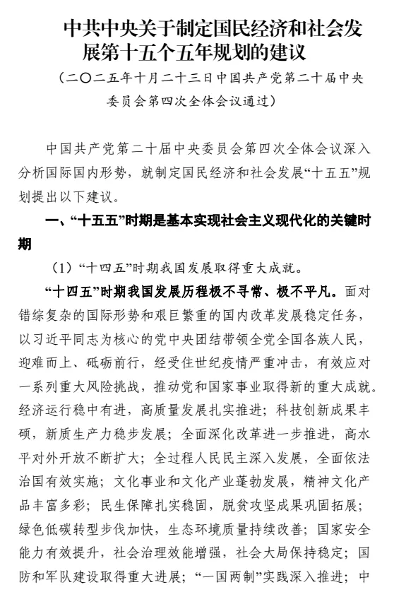 【十五五规划全文PDF速领】中共中央十五五规划建议全文已上线,附官方原文PDF可下载完整版!该规划经党的二十届四中全会审议通过,聚焦新质生产力、高质量发展、科技自立自强等核心议题,为中国式现代化擘画五年顶层设计。全文无删减、高清无水印,是时政学习、政策研究及公文写作的必备资料,速领取,精准把握未来发展战略方向!