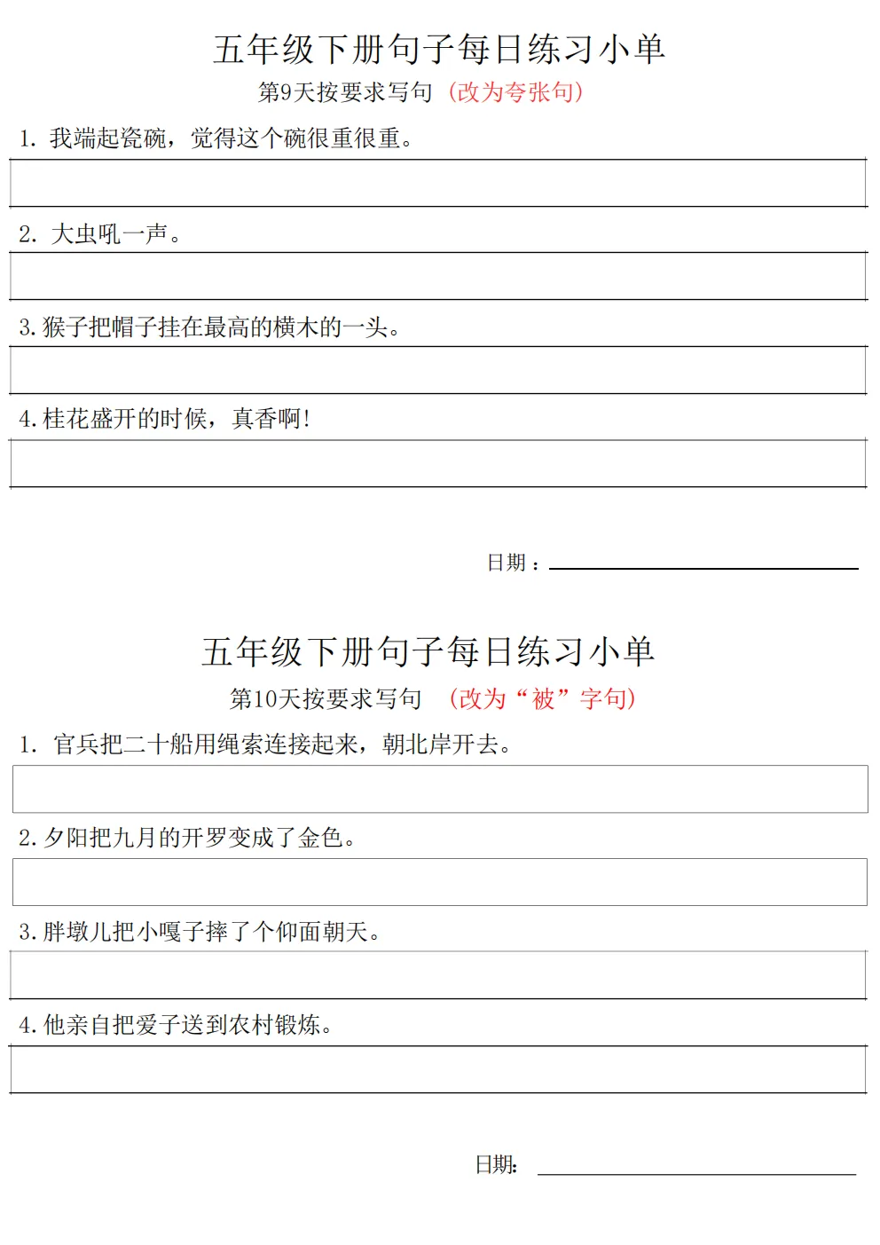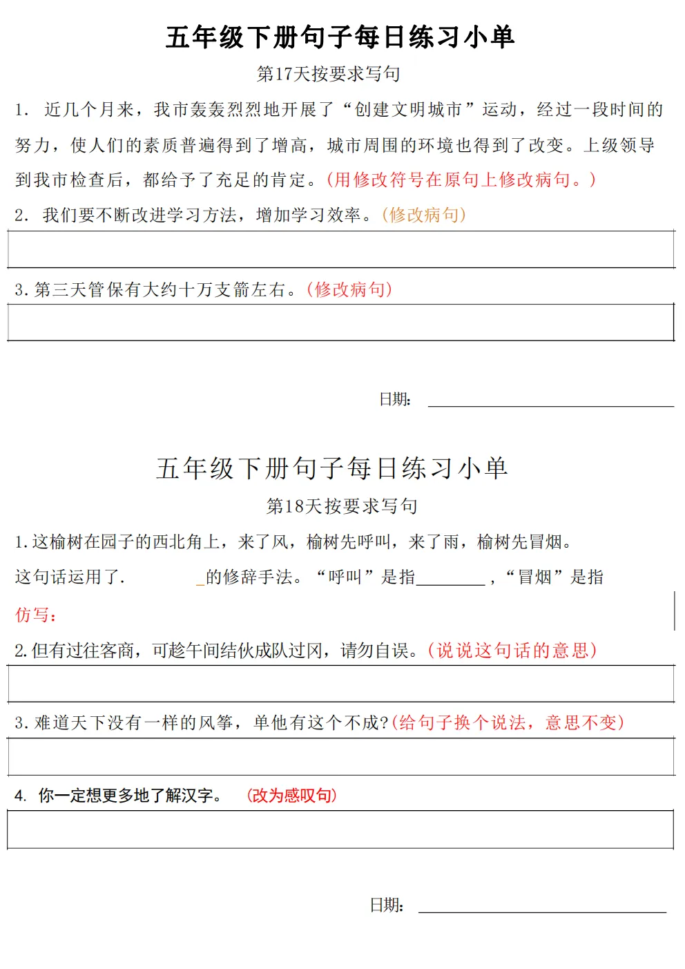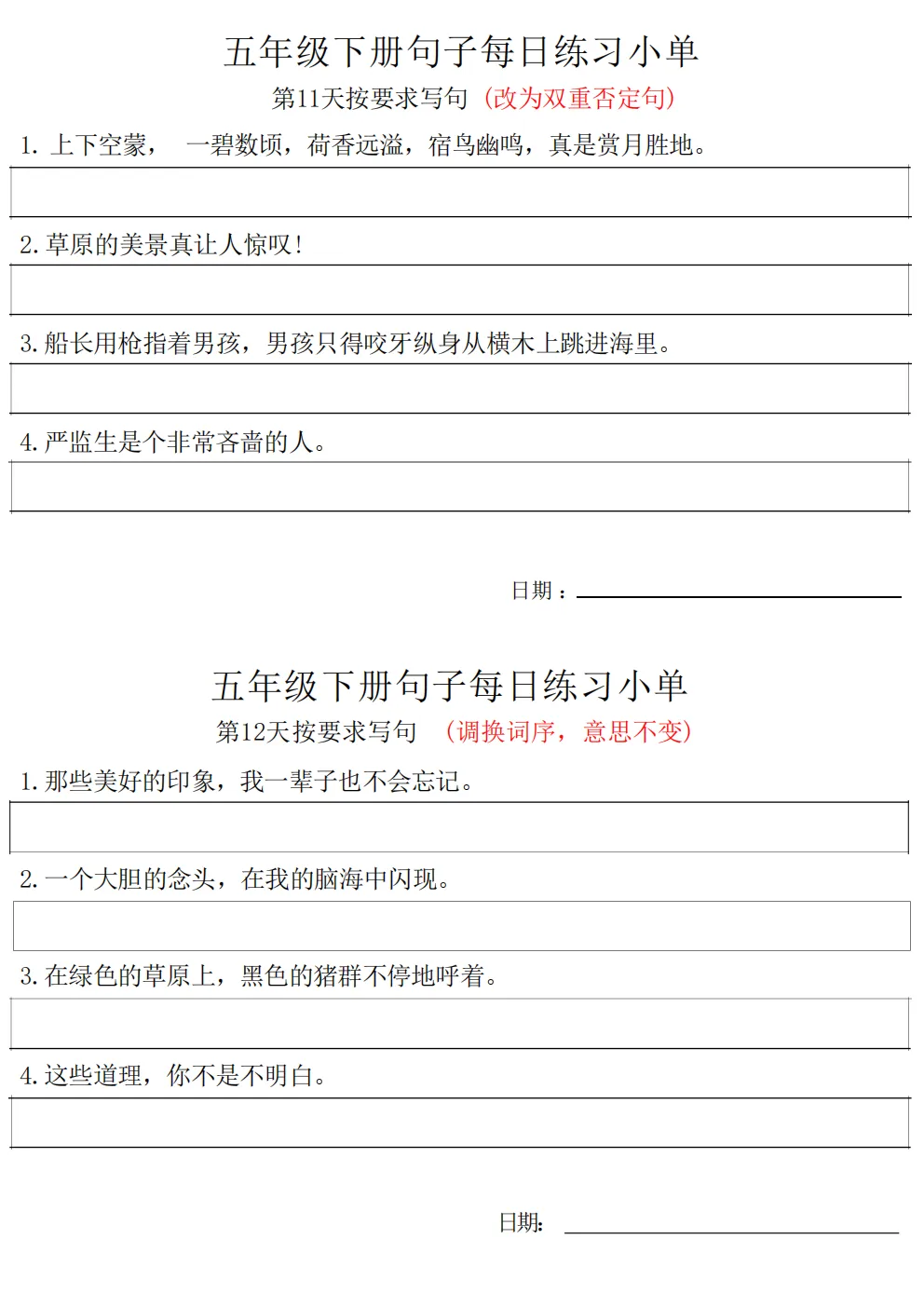 五年级下册语文每日句子练习题|电子版可打印