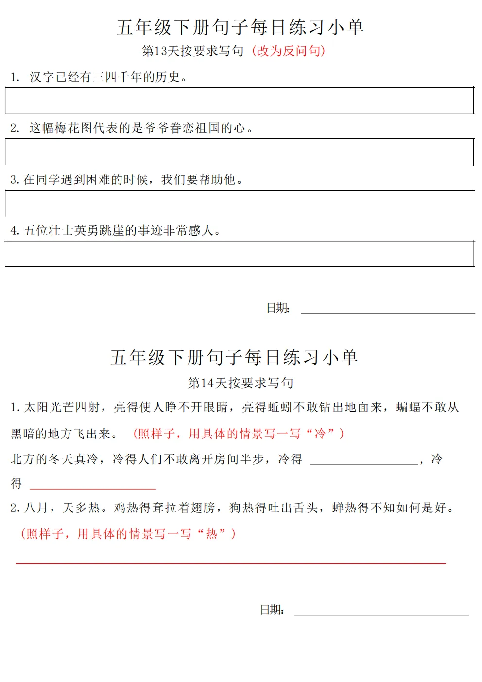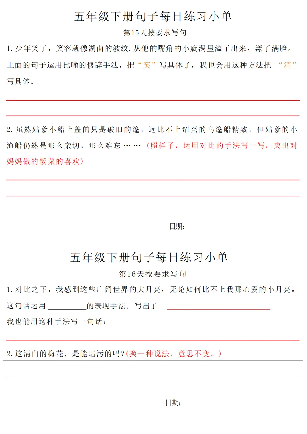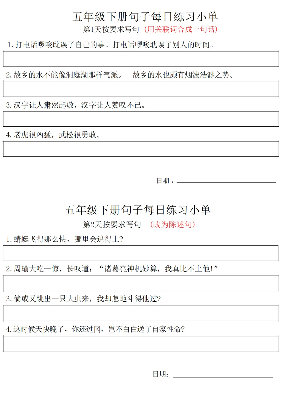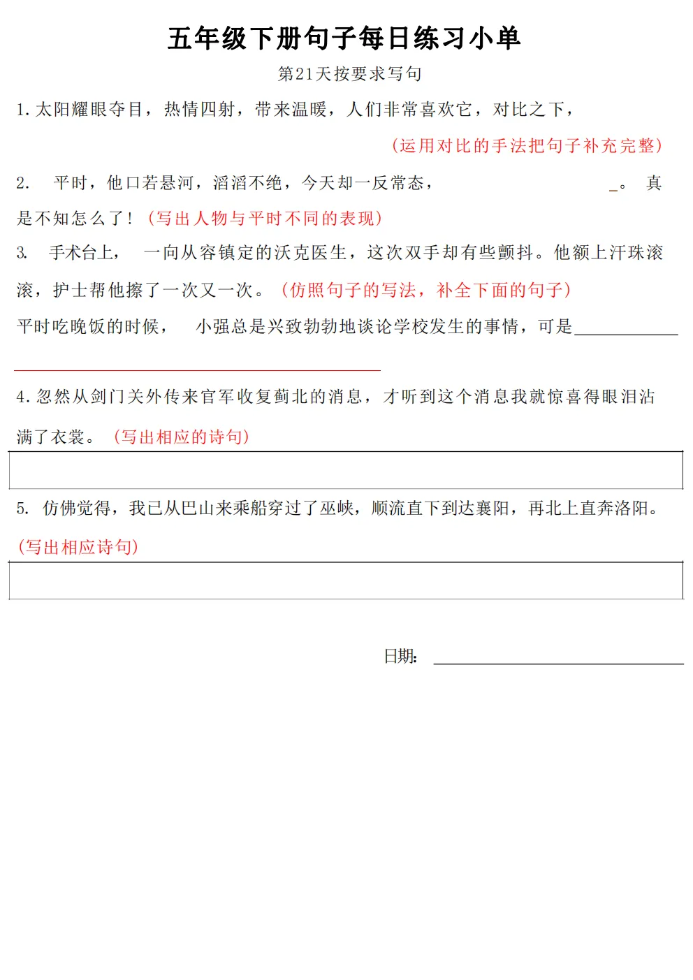 五年级下册语文每日句子练习题|电子版可打印