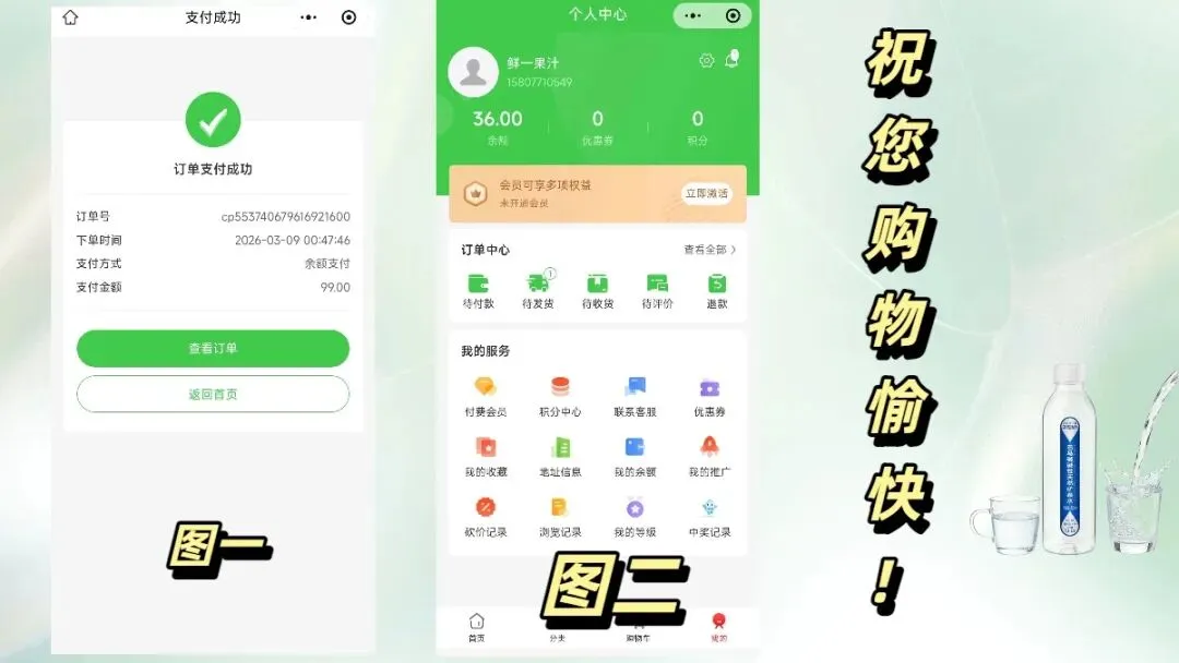上图中图一是支付完成后的界面,支付方式选择的是余额支付,返回到个人中心,可以看到充值100元,花了99元,还剩下1元,合并到余额账户里。留待下次购物时使用。