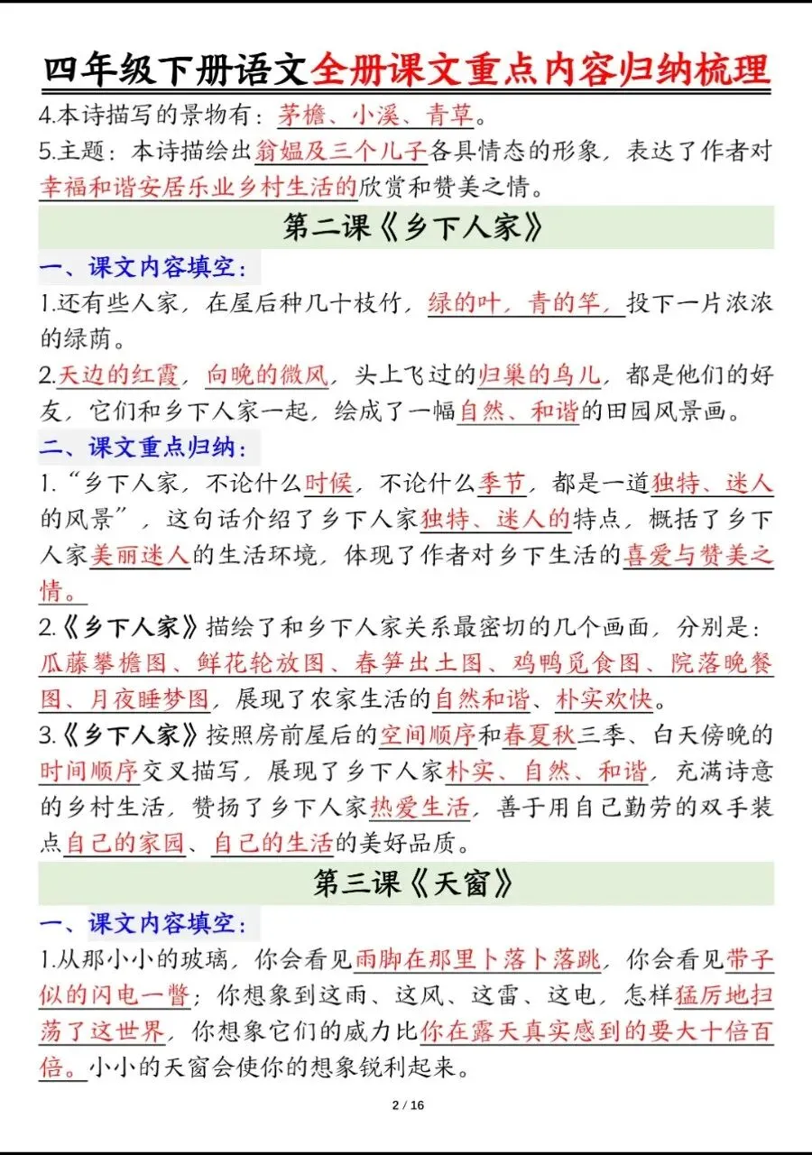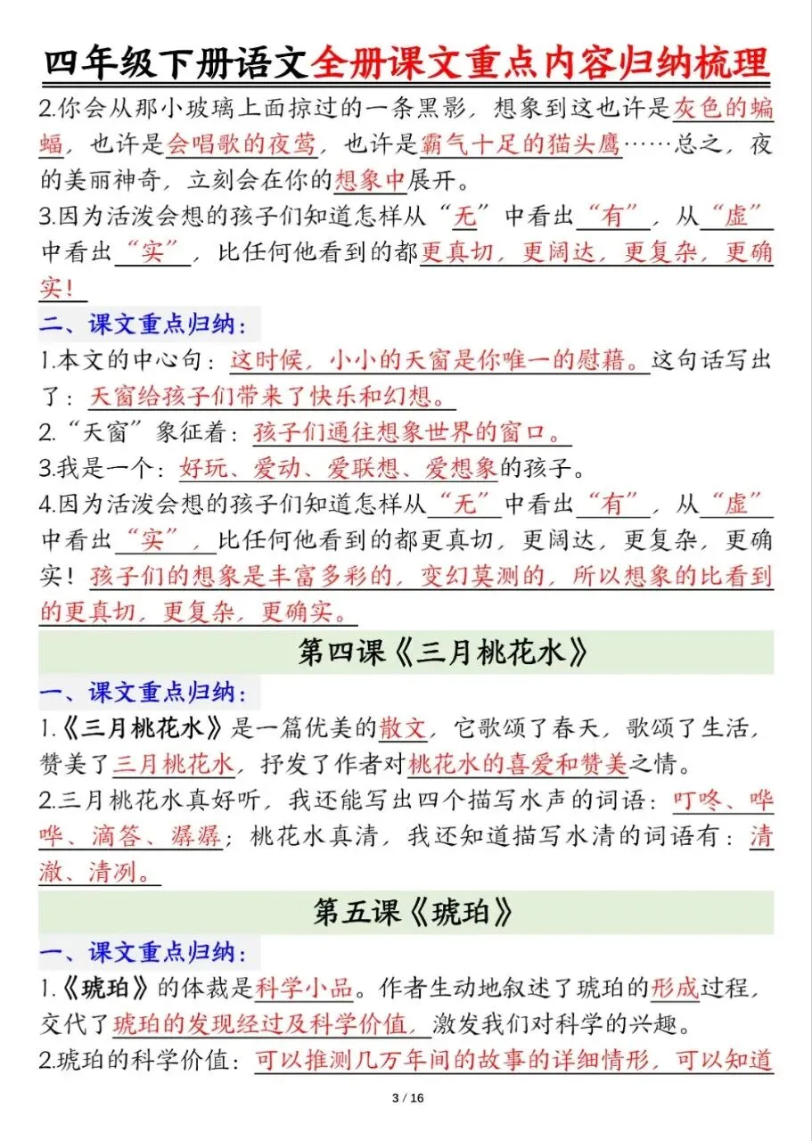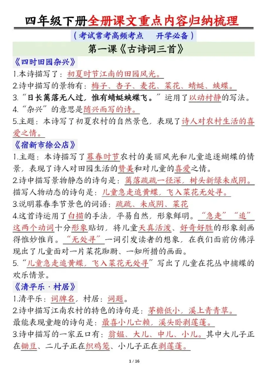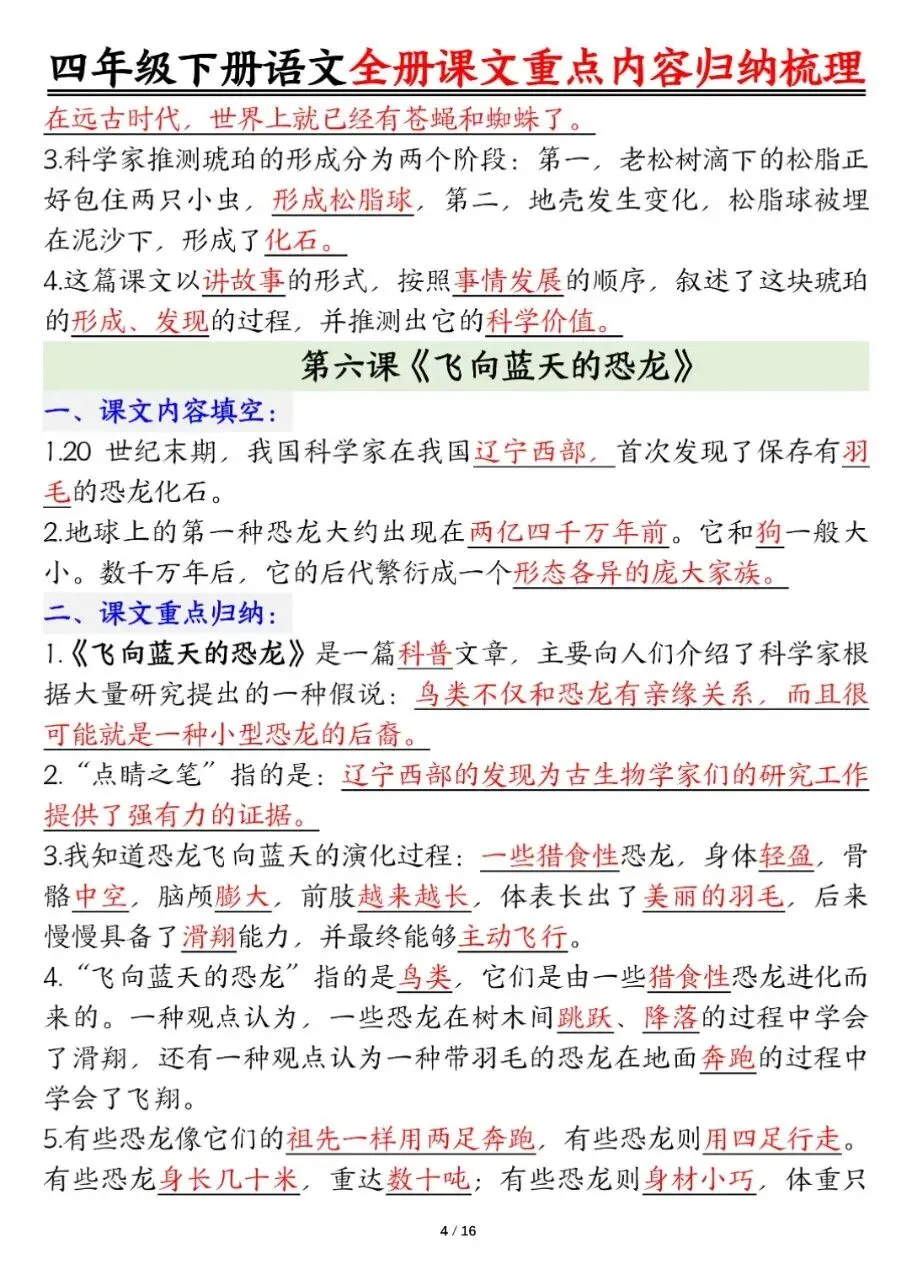 四年级下册语文(课文重点内容梳理),电子版可打印