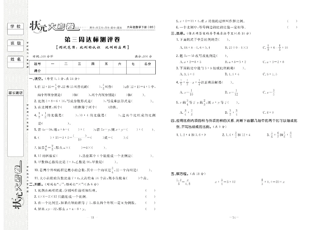 26春季北师版六年级下册数学《全册周考+月考+单元考+期中+期末测试卷》共23套含答案,完整高清可打印